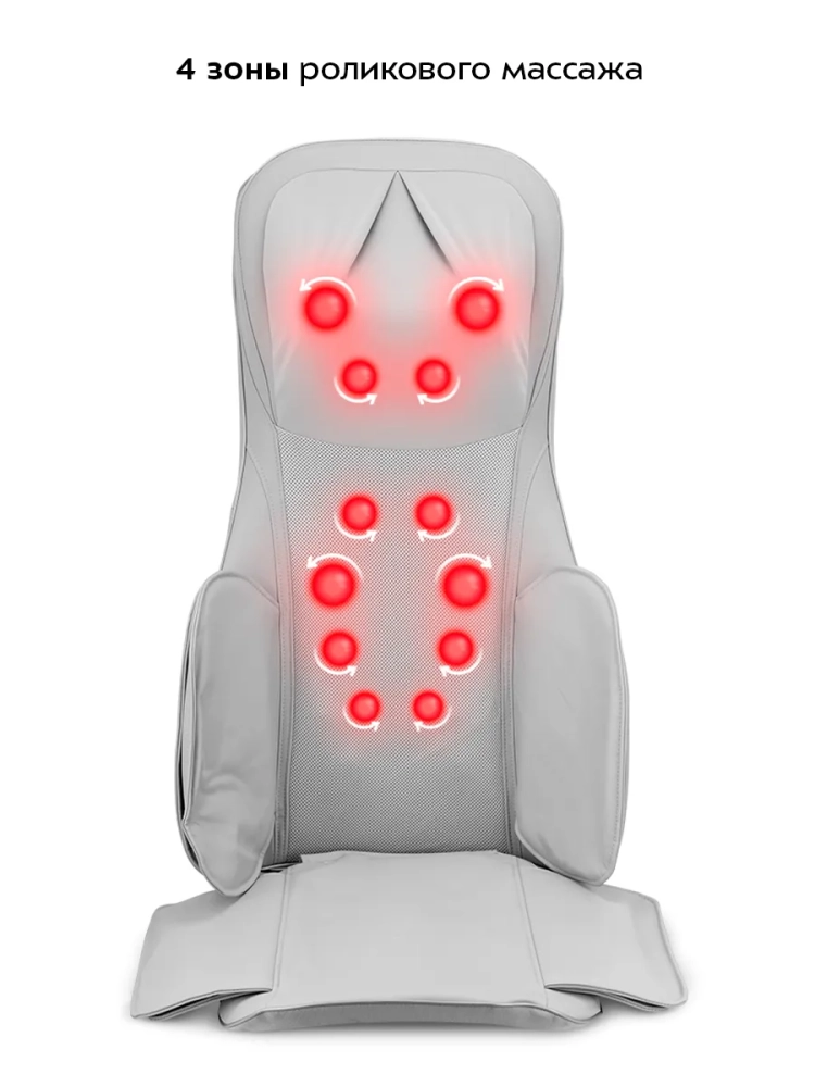 Массажер имеет 4 зоны роликового массажа: вся спина, плечевой пояс, поясница и шея. Высоту роликов зоны шеи можно отрегулировать под ваш рост.