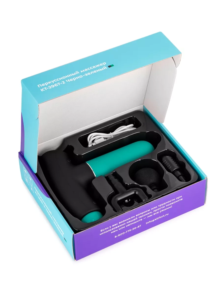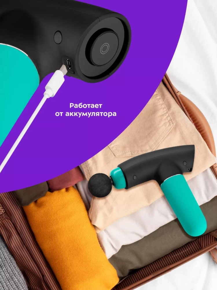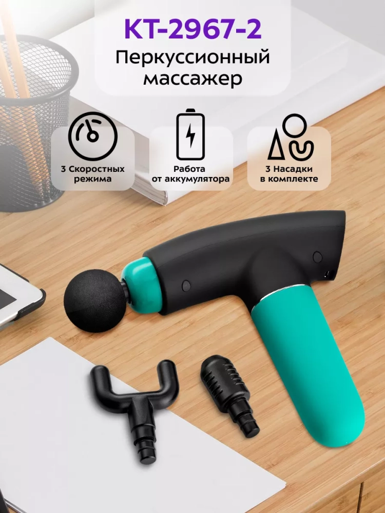 Модель КТ-2967 работает от аккумулятора, поэтому массажер можно брать с собой и использовать в любом удобном месте: в спортзале, в офисе, в поездках, в походах или дома. Можно делать массаж, не снимая одежду. Перкуссионный массажер позволит мышцам расслабиться, а также улучшит кровоток и избавит от боли.