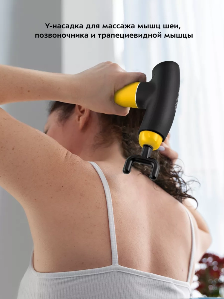 Насадки разных видов предназначены для воздействия на разные группы мышц и отдельные мышцы. Пулевидная насадка применяется для «разбивания» триггеров, проработки тканей и точечного массажа ладоней и стоп. Чрезмерное напряжение, резкие движения, растяжение провоцируют возникновение триггерных точек — плотных болезненных узлов в мышцах. Пулевидная насадка действует на проблемные зоны, прорабатывает триггеры и помогает расправить зажатые фасциальные волокна. Y-насадка используется для массажа мышц шеи, трапециевидной мышцы и мышц вдоль позвоночника. Круглая насадка более универсальная и используется почти для любых групп мышц, отлично подходит для проработки широких и крупных мышц.