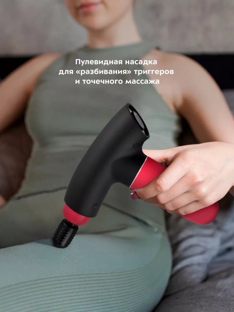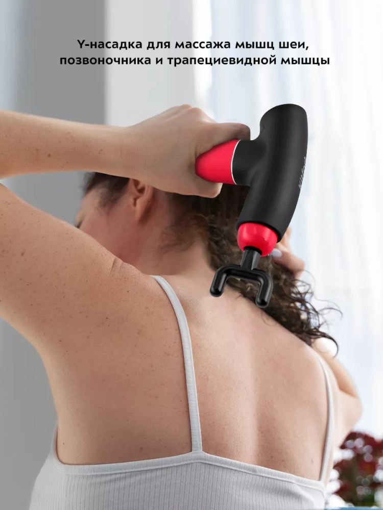 Насадки разных видов предназначены для воздействия на разные группы мышц и отдельные мышцы. Пулевидная насадка применяется для «разбивания» триггеров, проработки тканей и точечного массажа ладоней и стоп. Чрезмерное напряжение, резкие движения, растяжение провоцируют возникновение триггерных точек — плотных болезненных узлов в мышцах. Пулевидная насадка действует на проблемные зоны, прорабатывает триггеры и помогает расправить зажатые фасциальные волокна. Y-насадка используется для массажа мышц шеи, трапециевидной мышцы и мышц вдоль позвоночника. Круглая насадка более универсальная и используется почти для любых групп мышц, отлично подходит для проработки широких и крупных мышц.