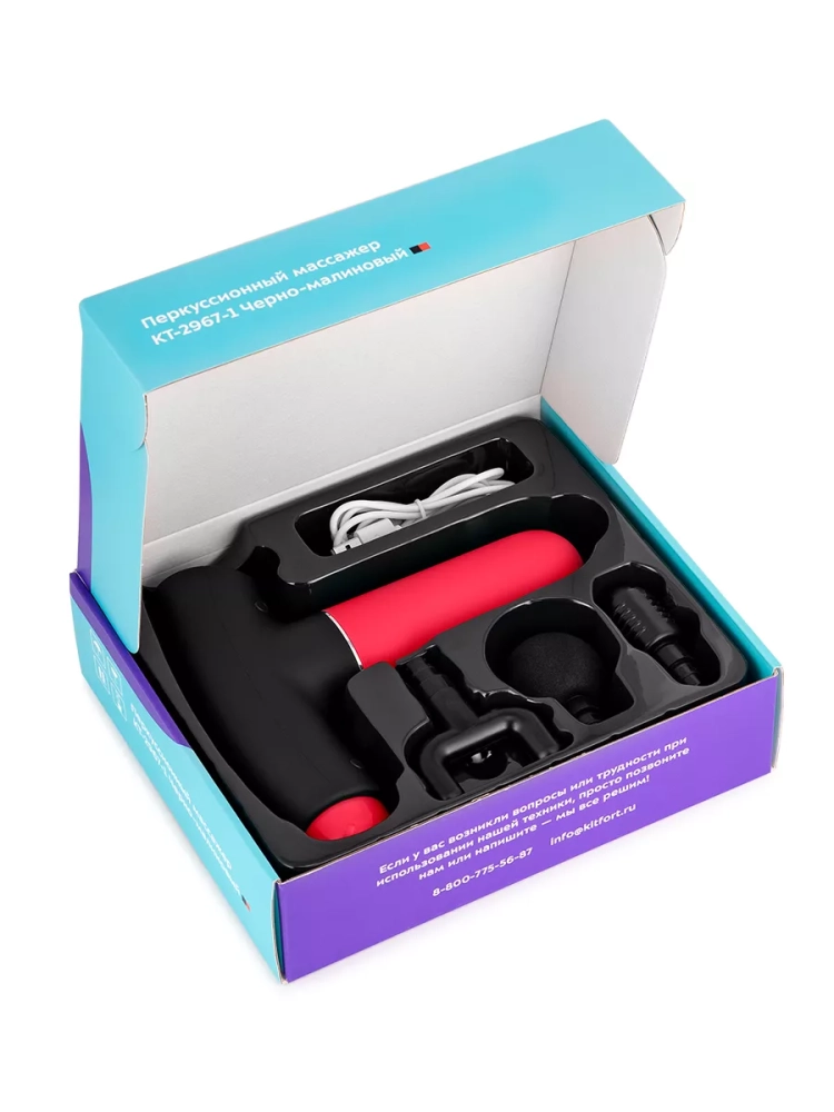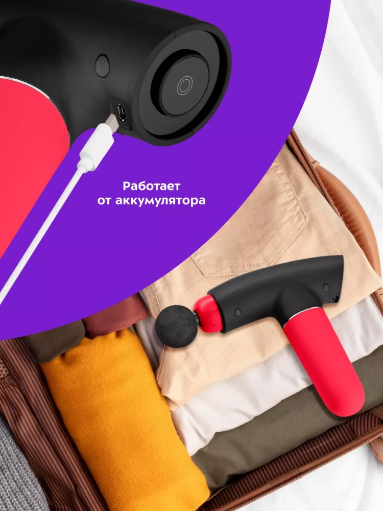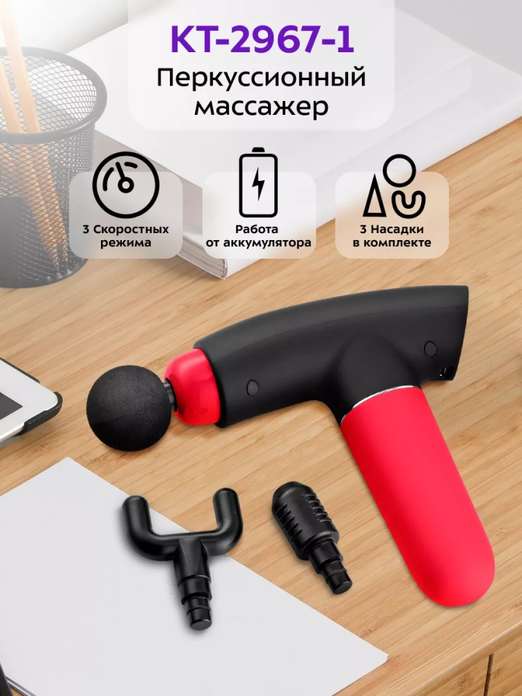 Модель КТ-2967 работает от аккумулятора, поэтому массажер можно брать с собой и использовать в любом удобном месте: в спортзале, в офисе, в поездках, в походах или дома. Можно делать массаж, не снимая одежду. Перкуссионный массажер позволит мышцам расслабиться, а также улучшит кровоток и избавит от боли.