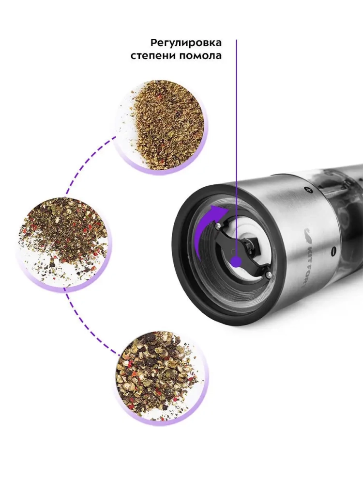 Электрическая мельница оснащена мощным мотором, который гарантирует эффективное измельчение специй без усилий. Благодаря этому, вы можете легко регулировать степень помола, что позволяет адаптировать вкус блюд по вашему желанию. Мельница для специй выполнена из высококачественных материалов, что обеспечивает долговечность и надежность в использовании.