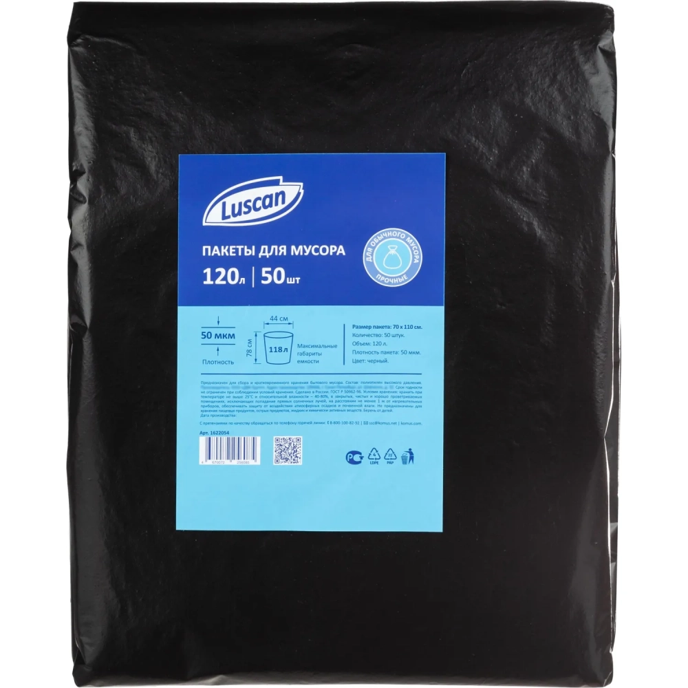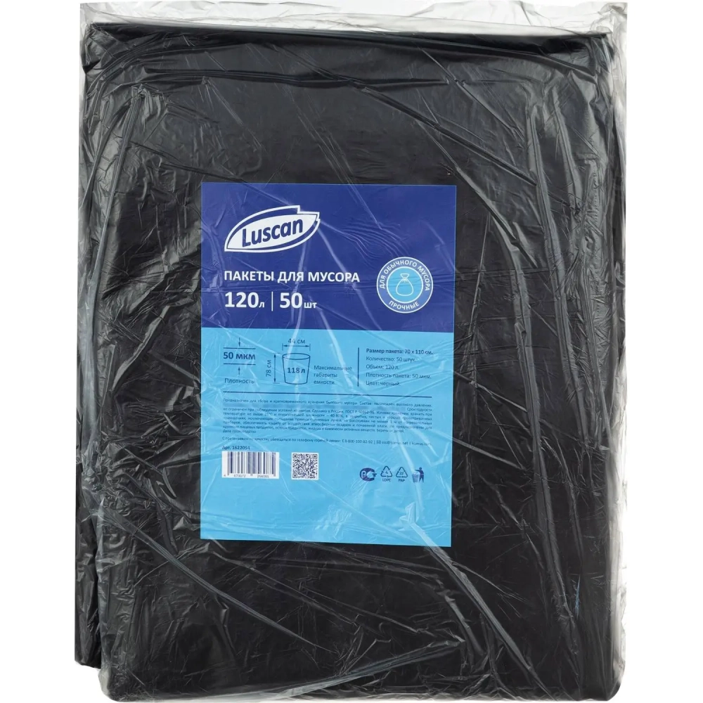 Мешки для мусора ПВД 120л 50мкм 50шт/уп черные 70х110см Luscan