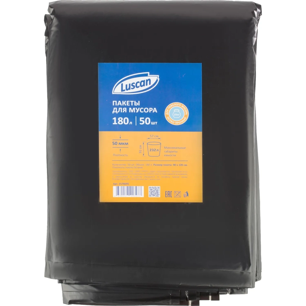 Мешки для мусора ПВД 180л 50мкм 50шт/уп черные 90x120см Luscan