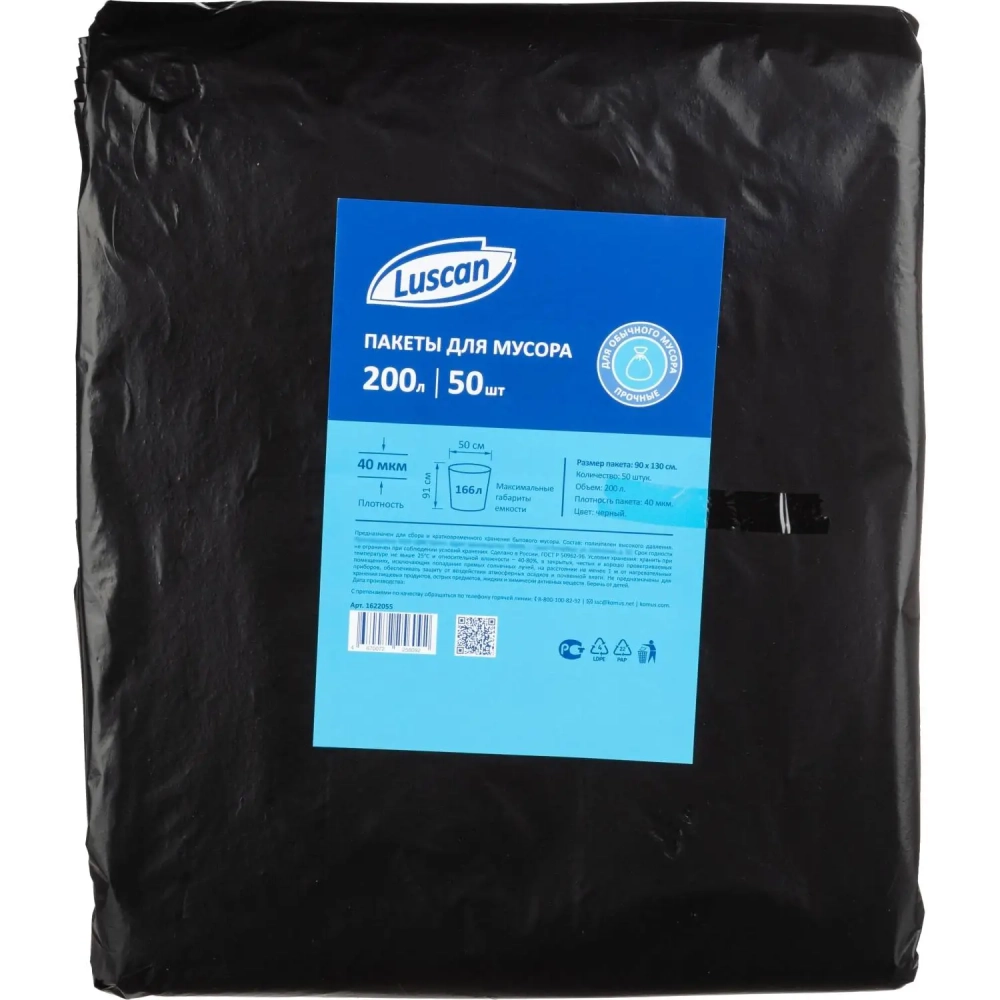 Мешки для мусора ПВД 200л 40мкм 50шт/уп черные 90х130см Luscan