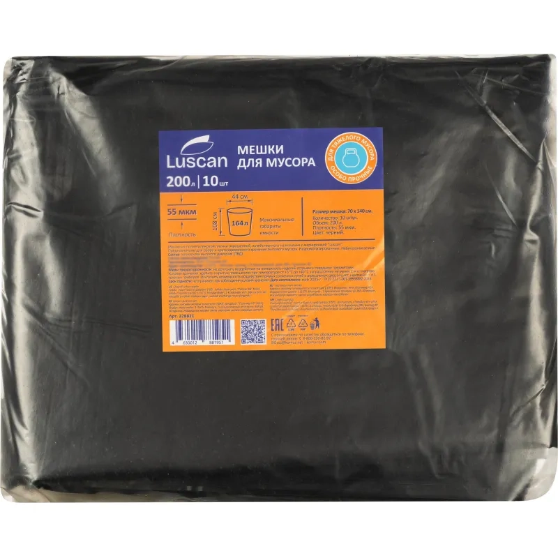 Мешки для мусора ПВД 200л 55мкм 10шт/уп черные 70х140см Luscan_СПБ