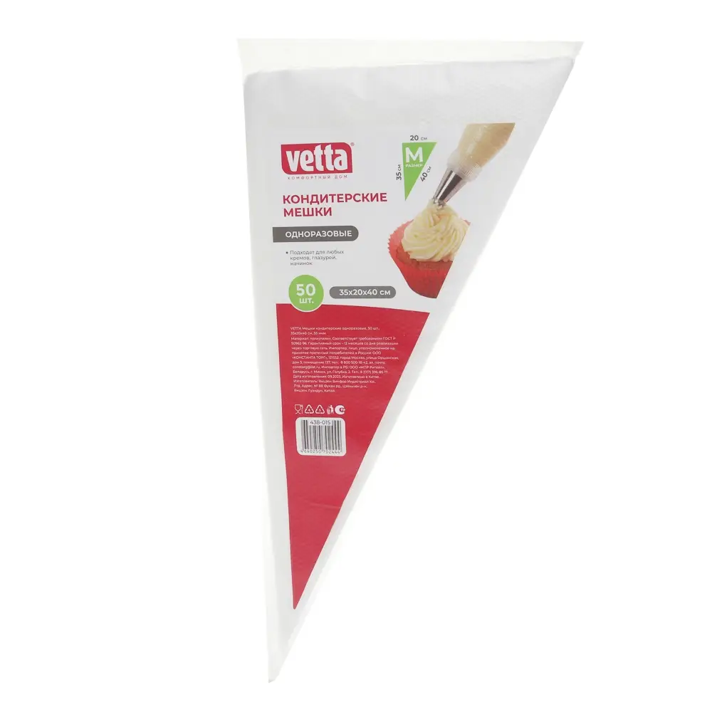 Кондитерские мешки - отличный помощник на кухне, подходят для работы с кремом, глазурью, шоколадом и т.п. Если вы часто балуете близких тортами и различными десертами с кремом, то вам просто необходим кондитерский мешок. Кондитерские мешки универсальны, их можно использовать с любыми кондитерскими насадками (уголок мешка обрезается под размер насадки). С помощью этого мешка 35x20x40 см украшение десертов доставит вам только удовольствие. Комплект состоит из 50 одноразовых пакетов.