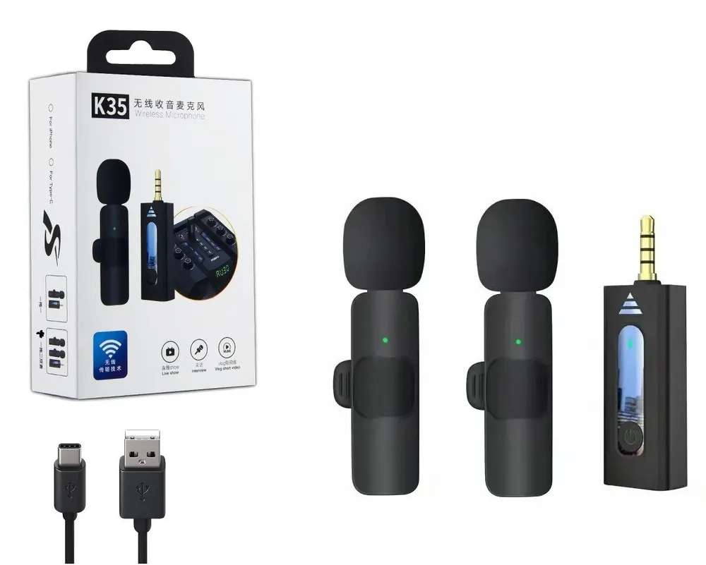 2в1 Петличные микрофоны беспроводные 3.5mm AUX K35 (2 беспроводных микрофона петлички с приемником аукс 3,5мм)