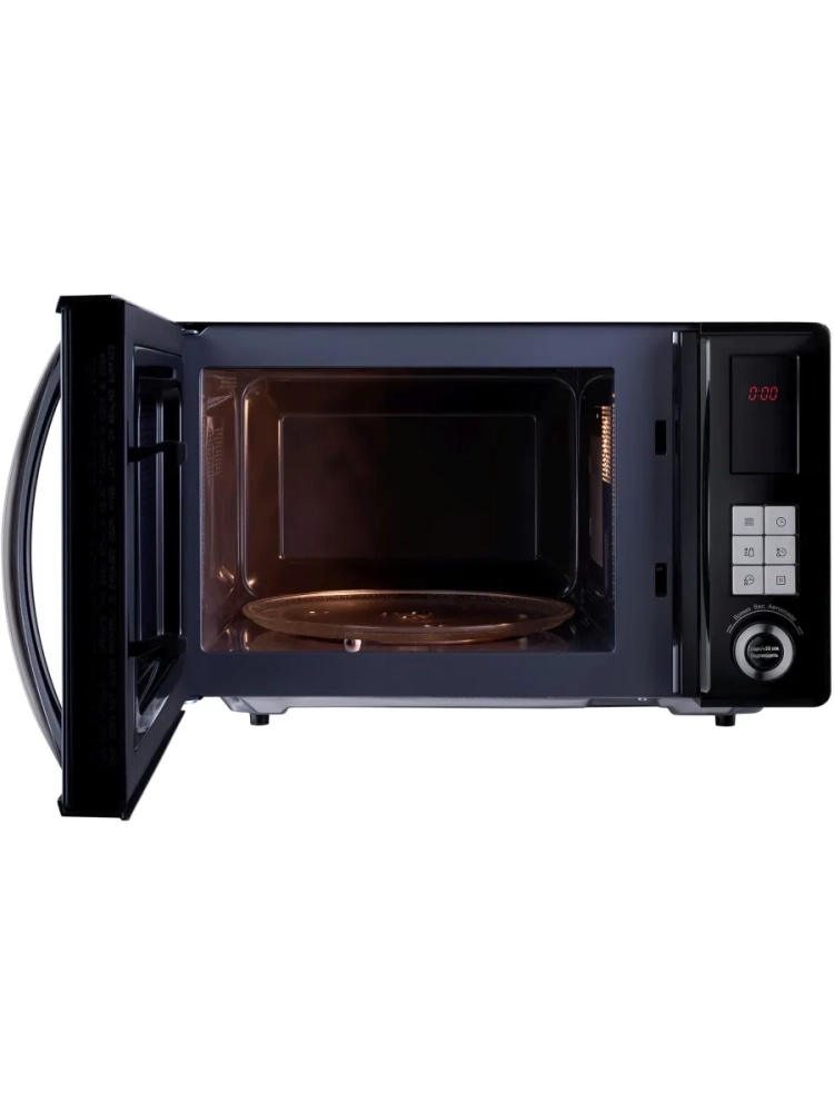 Объём внутренней камеры составляет 23 литра, что позволяет с комфортом размещать блюда для разогрева или приготовления на несколько персон. Мощность микроволн 800 Вт обеспечивает быстрое и равномерное нагревание продуктов. Вращающийся поддон диаметром 270 мм способствует качественному распределению волн по всему объёму.