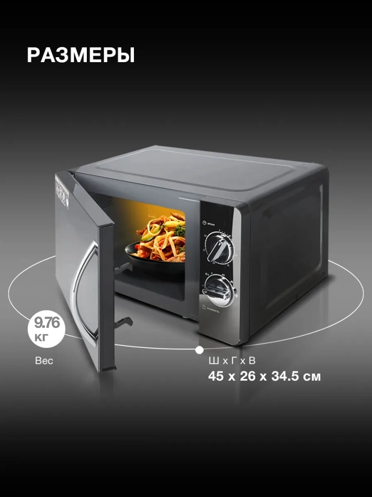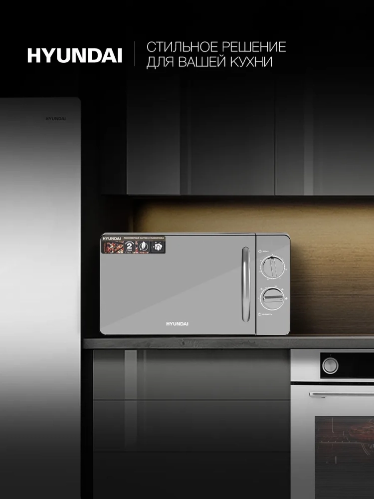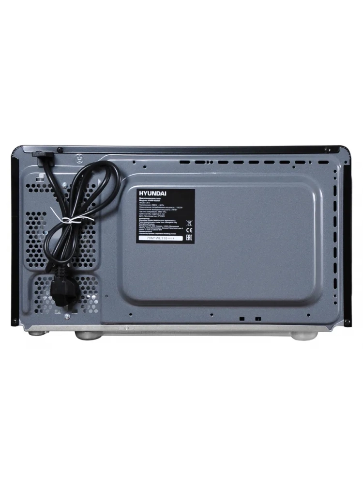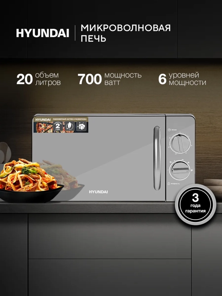 Микроволновая печь Hyundai HYM-M2007 с объемом камеры 20 литров и выходной мощностью 700 Вт предназначена для разогрева, разморозки и приготовления пищи. Оснащена вращающейся платформой для равномерного нагрева и шестью уровнями мощности (от 17% до 100%), включая режим разморозки (37%). Управление осуществляется с помощью механических ручек (таймер и мощность).