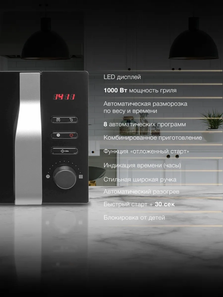 Устройство оснащено электронным управлением и удобным дисплеем, который отображает выбранные настройки и время приготовления. Дверца открывается ручкой, а внутренняя камера покрыта эмалью легкой очистки, что упрощает уход. Поворотный стол диаметром 255 мм обеспечивает равномерный нагрев пищи.