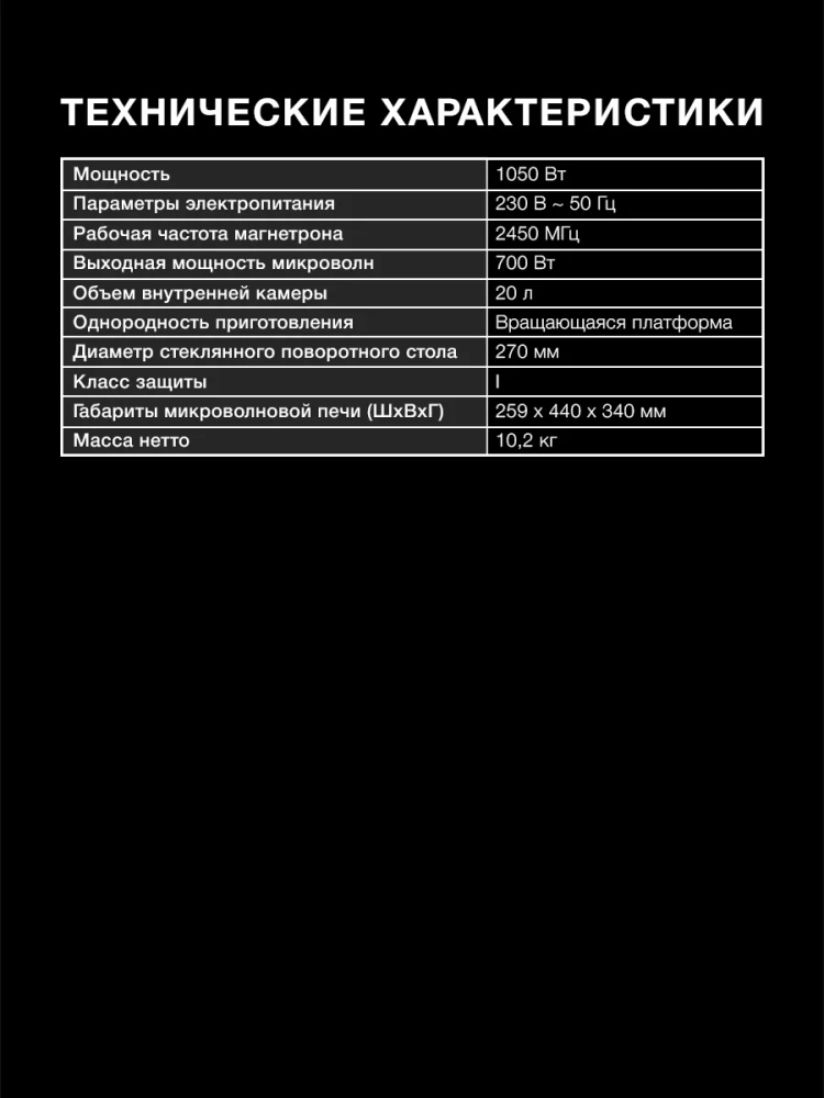 СВЧ Hyundai HYM-M2063 предназначена для разогрева пищи и размораживания продуктов. Модель отличается простотой и минимальным набором функций. В этом варианте не придется переплачивать за то, что не используется. Особенно привлекателен дизайн, выполненный в черном цвете. Исключения составляют белые графические символы и логотип. Два поворотных переключателя отвечает за управление. С их помощью устанавливаются мощность и время. Дальше печь автоматически переходит в рабочий режим. По окончании работы прозвучит звуковой сигнал. Внутренняя поверхность покрыта специальной эмалью, с которой легко убрать любые виды загрязнений. Рекомендуется размещать печь на столешнице. Она не займет много места благодаря компактным размерам. Кабель питания располагается сзади, что очень удобно для подключения. Прорезиненные ножки исключают скольжение и обеспечивают устойчивость на любой поверхности.