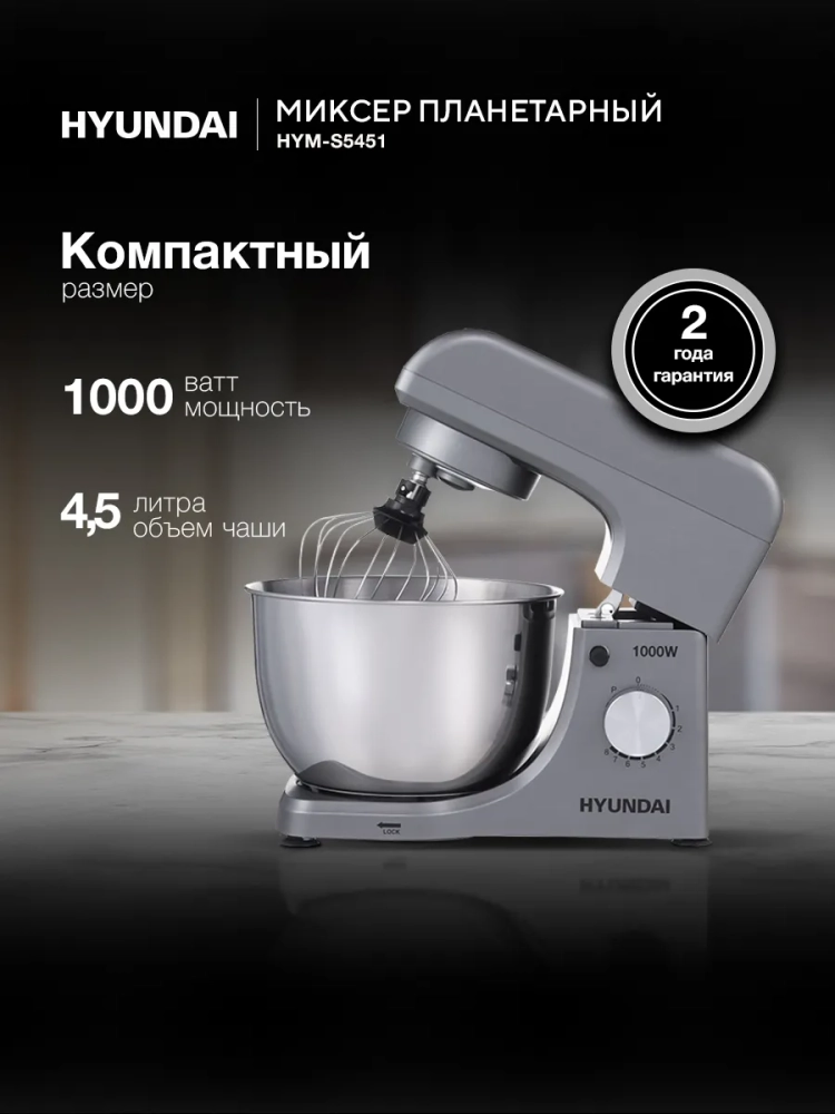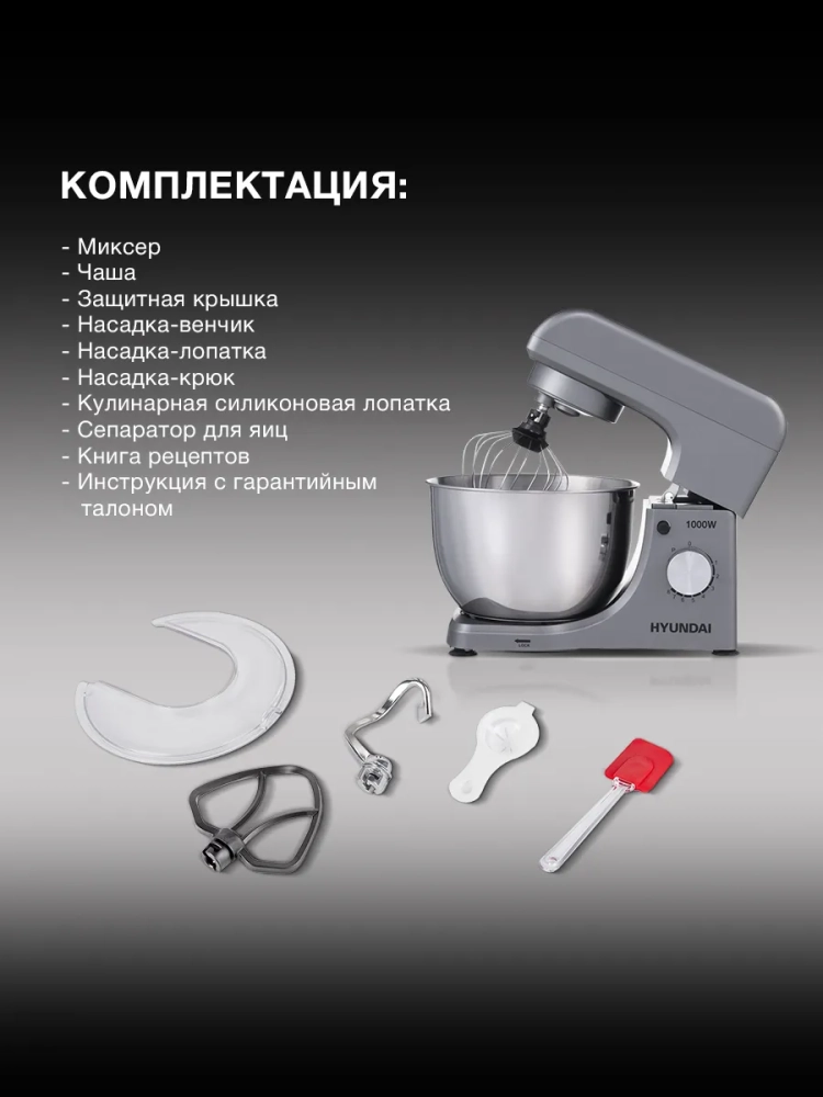 Миксер планетарный Hyundai HYM-S5451 серый/черный, мощность 1000Вт, количество скоростей 8, насадок 3 . Комплектация: Планетарный миксер; чаша; защитная крышка; насадка-венчик; насадка-крюк; насадка-лопатка; кулинарная силиконовая лопатка; сепаратор для яиц; руководство пользователя с гаратийным талоном; книга рецептов.