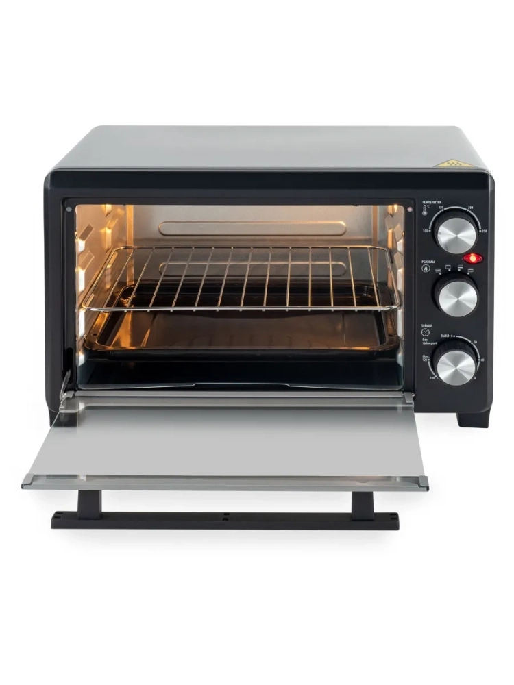 Мини-печь Hyundai MIO-HY072 серебристый/черный, мощность 1500Вт, объем духовки 23л., механическое управление, температура терморегулятора 100С-250С.