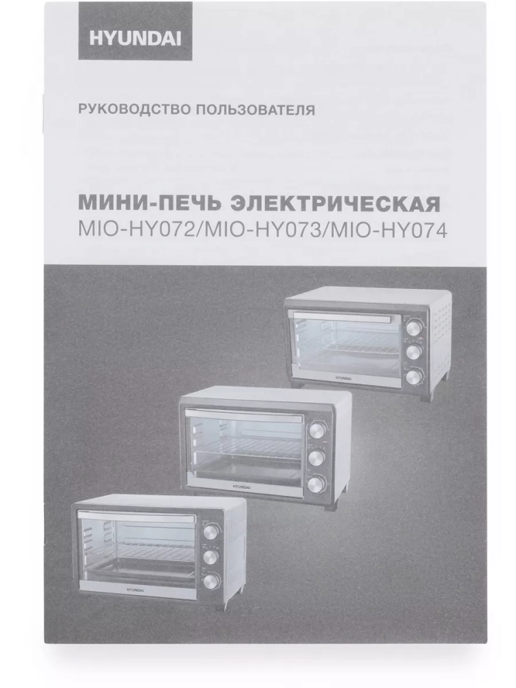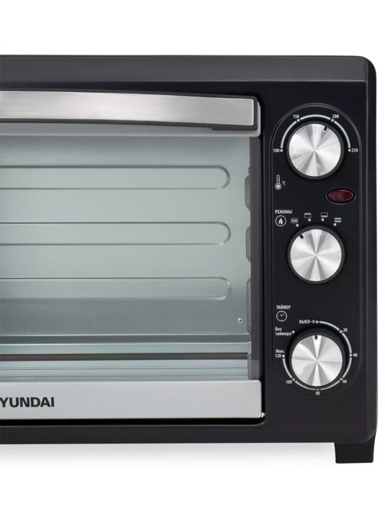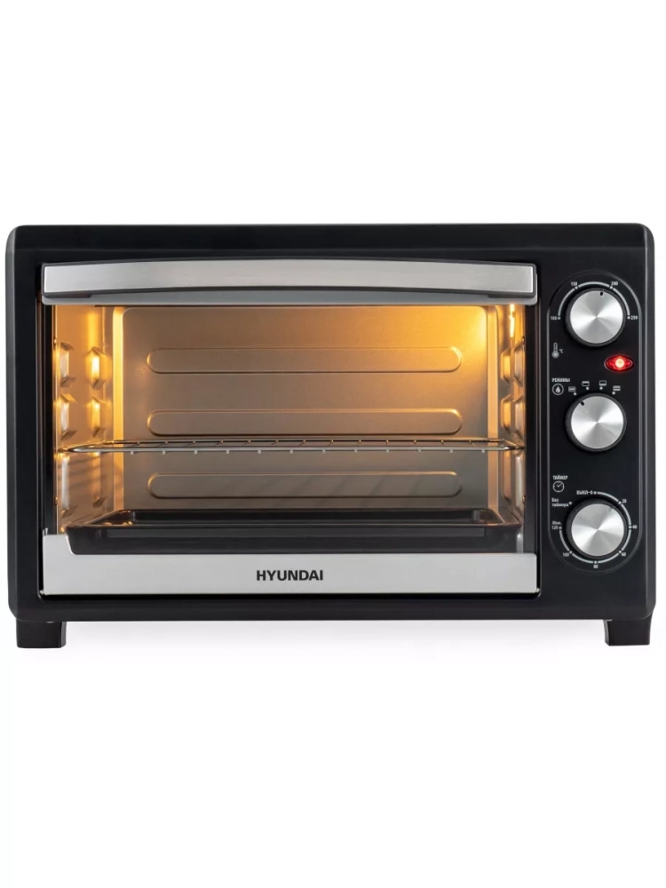 Мини-печь Hyundai MIO-HY073 серебристый/черный, мощность 1500Вт, объем духовки 26л., механическое управление, температура терморегулятора 100-250 С, размеры противня349.5x250x20.5