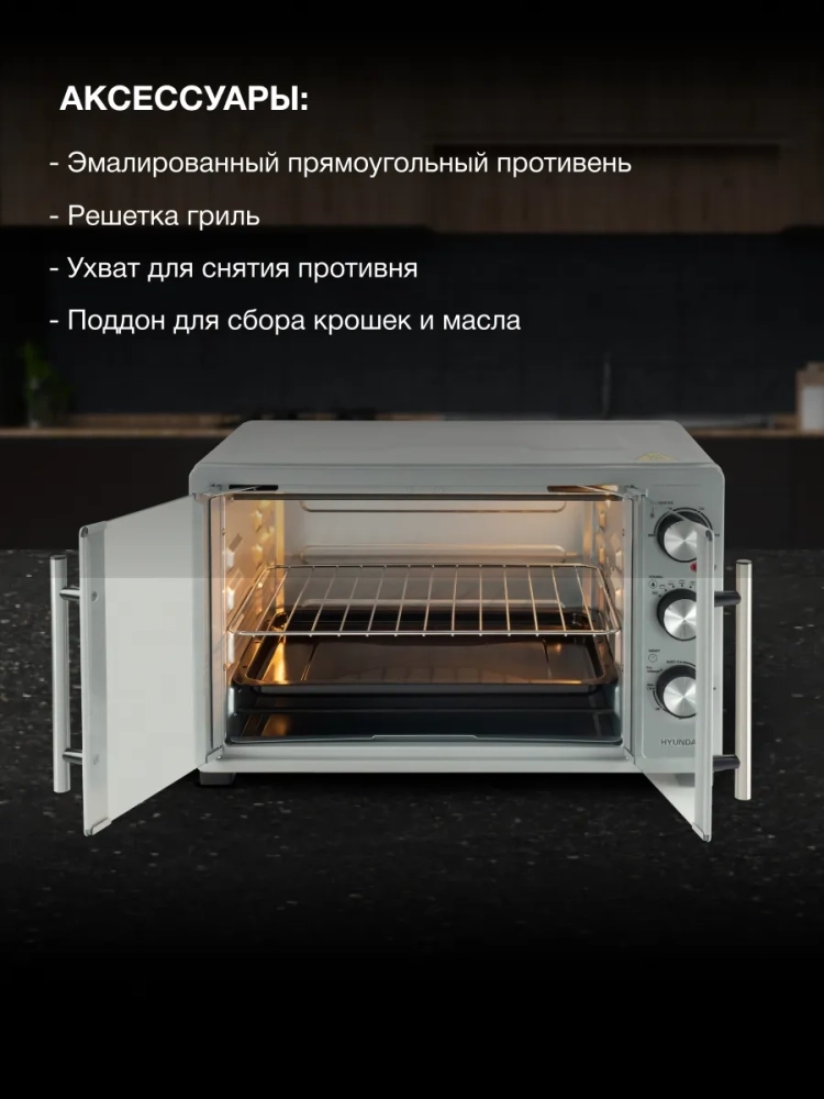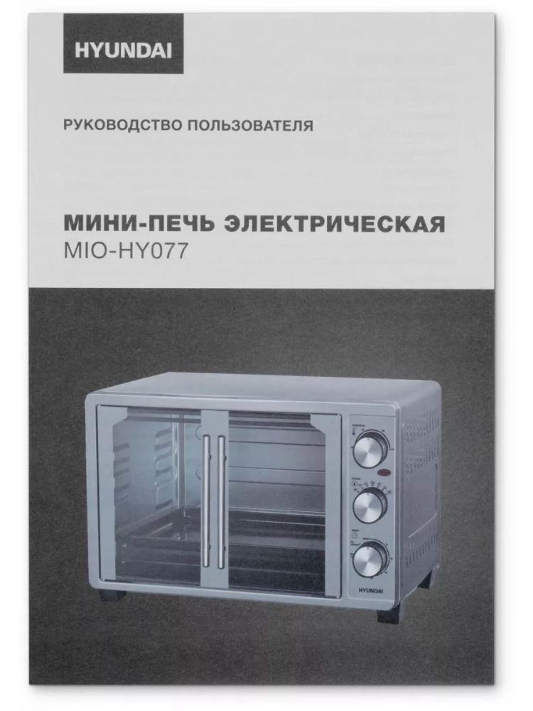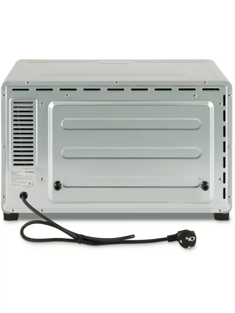 Мини-печь Hyundai MIO-HY077 серебристый, мощность 1500Вт, объем духовки 30л., механическое управление, температура терморегулятора 100-250 С.