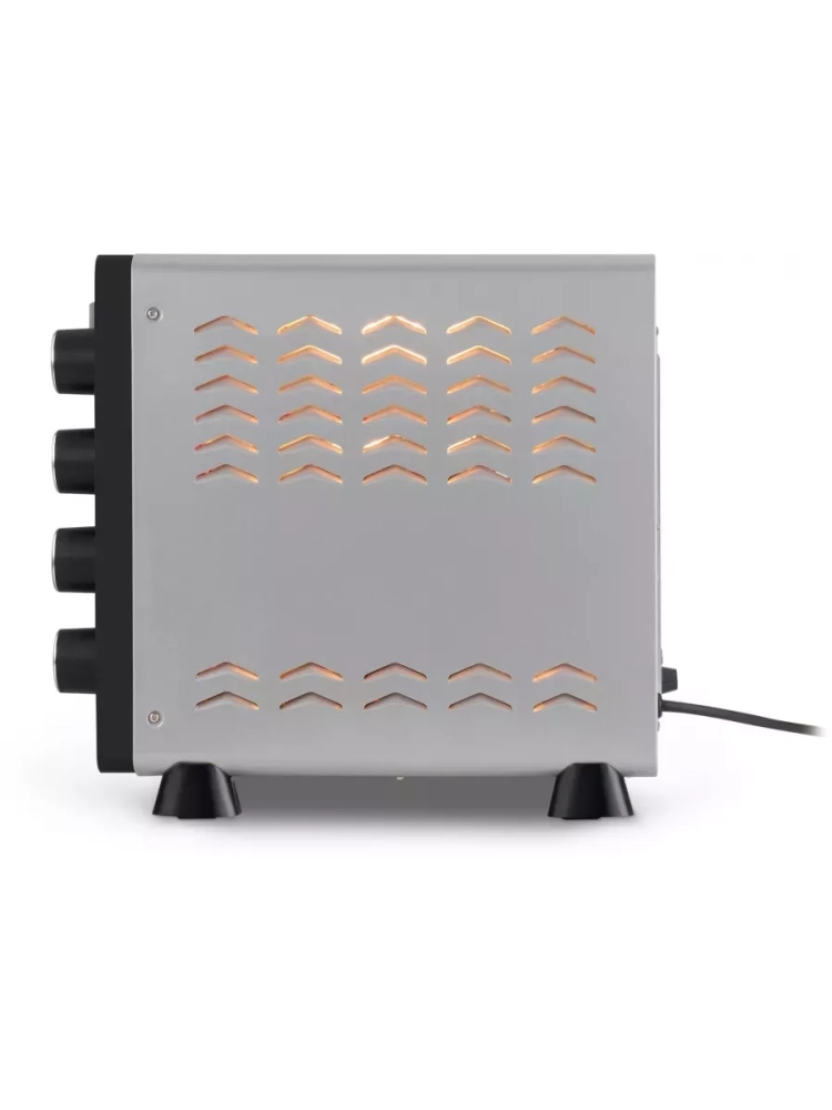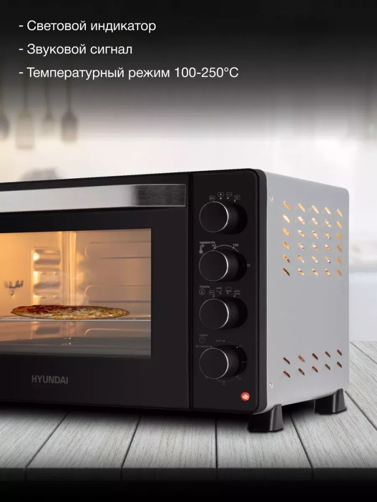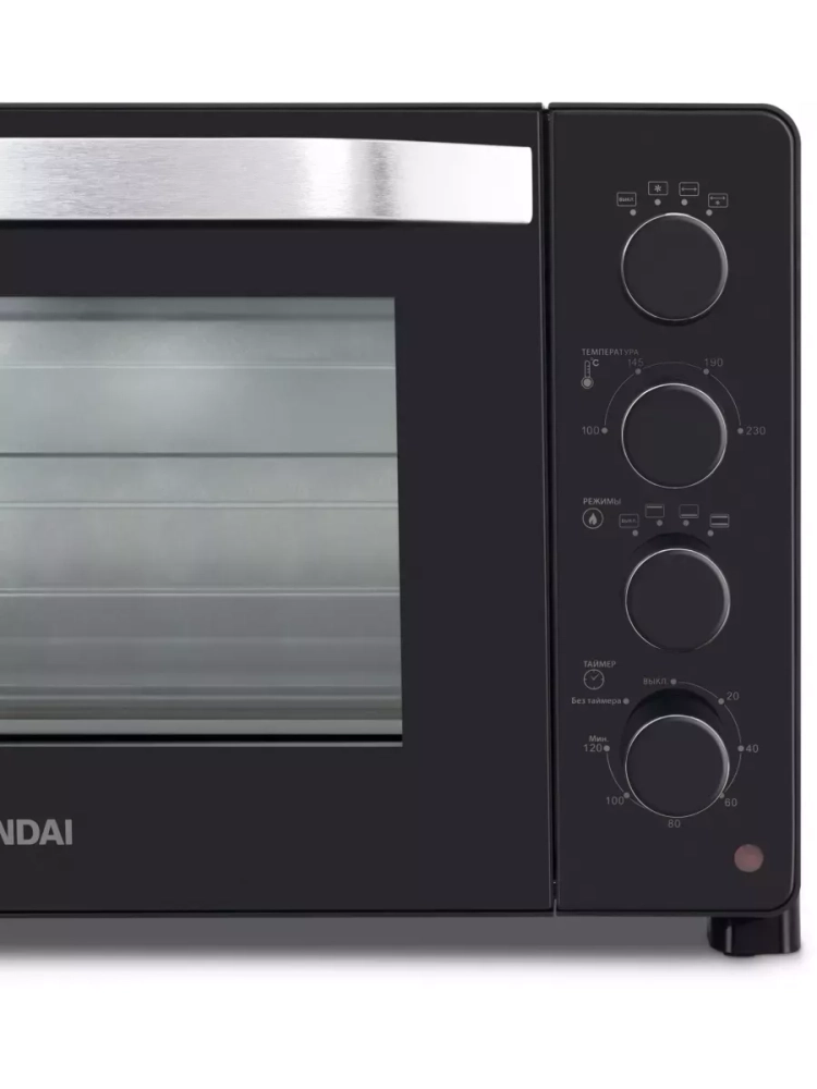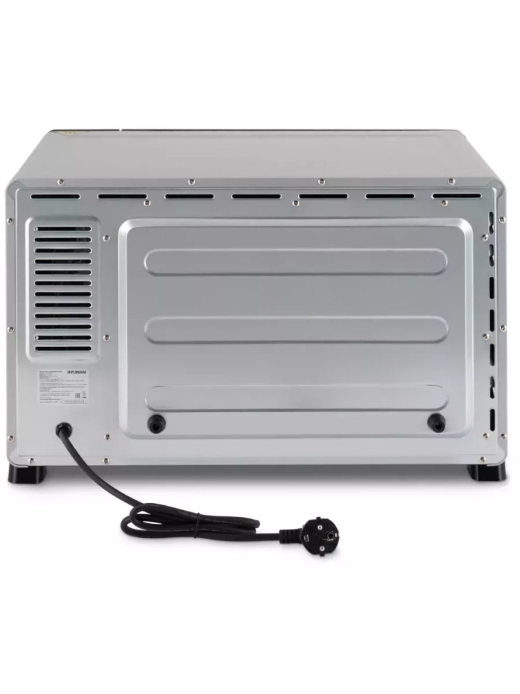 Мини-печь Hyundai MIO-HY081 серебристый/черный, мощность 2000Вт, объем духовки 38л., механическое управление, температура терморегулятора 100-250 С. Двойное стекло, современный дизайн, ручка из аллюминия, корпус не нагревается так, как у обычных моделей. размеры противня391.8x307x20.5