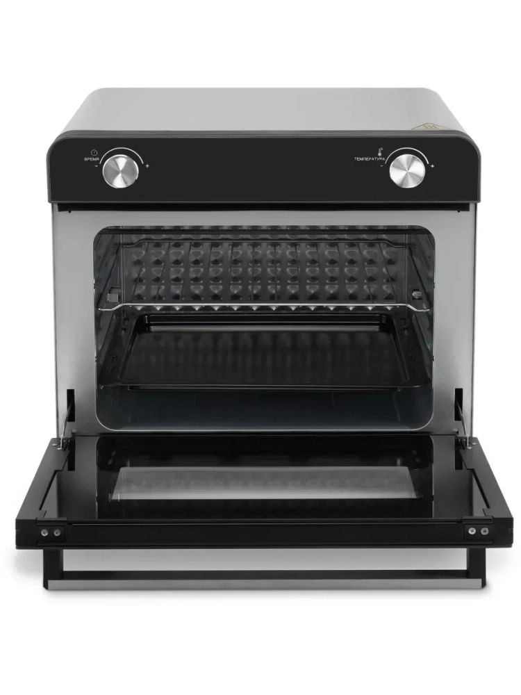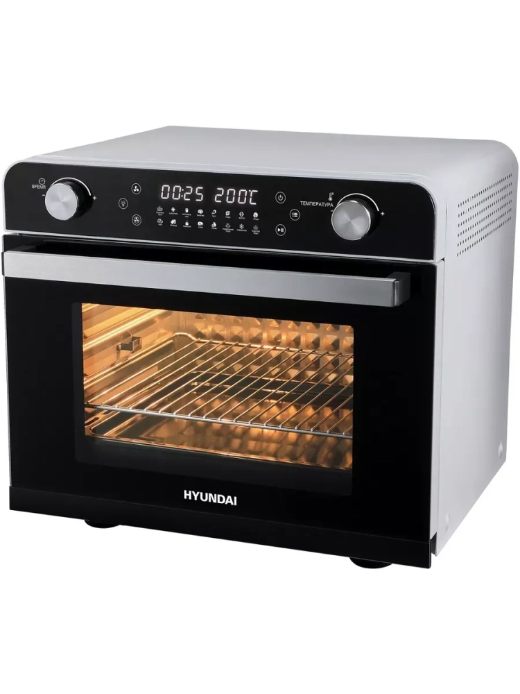 Мини-печь Hyundai MIO-HY087 серебристый/черный, мощность 1700Вт, объем духовки 36л., сенсорное управление, функция аэрогриля, ручка из нержавеющей стали