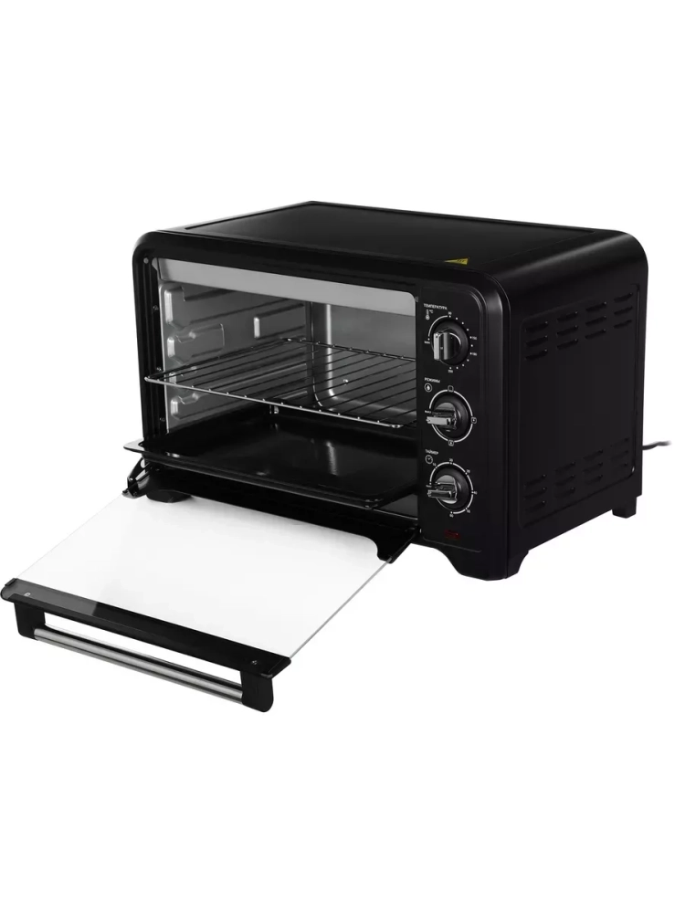Удобное механическое управление. Мини-печь оснащена тремя удобными и стильными поворотными переключателями. С помощью верхней ручки устанавливайте температуру в диапазоне от 90 до 250°C. Средний переключатель предназначен для выбора режимов работы, а нижний – для настройки таймера.