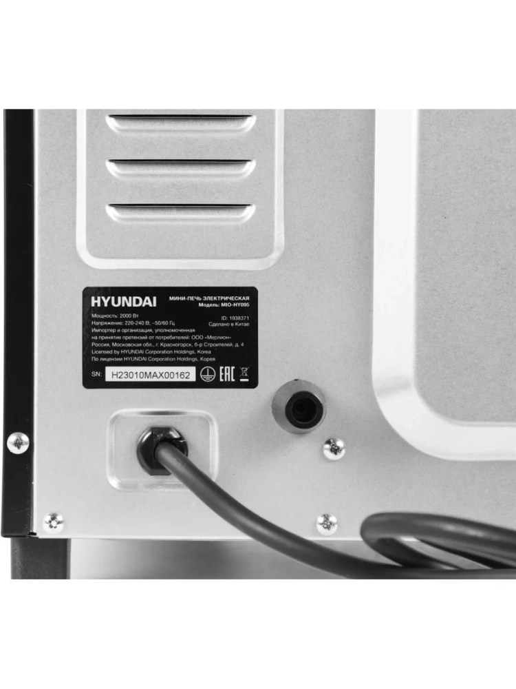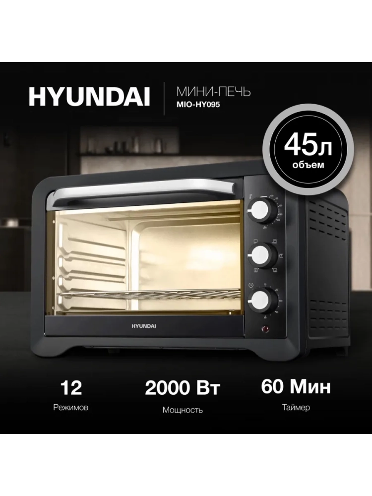 Мини-печь Hyundai MIO-HY095 черный, мощность 2000Вт, объем духовки 45л., механическое управление.