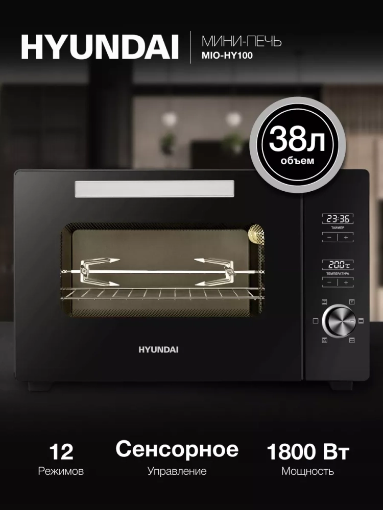 Мини-печь Hyundai MIO-HY100 черный, мощность 1800Вт, объем духовки 38л., сенсорное управление, двойное стекло