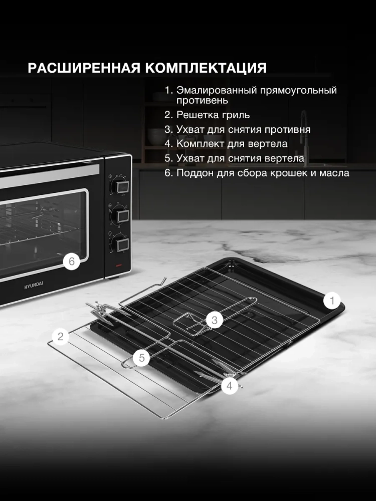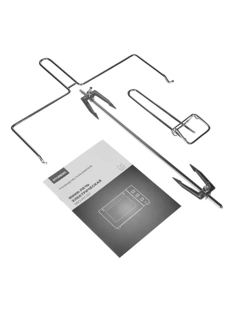В комплект входит эмалированный противень, решетка-гриль, аксессуары для съема противня и вертела, а также поддон для сбора крошек и масла. Таймер рассчитан на 60 минут — после завершения установленного времени срабатывает автоматическое отключение. Конструкция устройства продумана до мелочей: ножки с нескользящей опорой обеспечивают устойчивость, а декоративные ручки из нержавеющей стали придают мини-печи стильный вид.