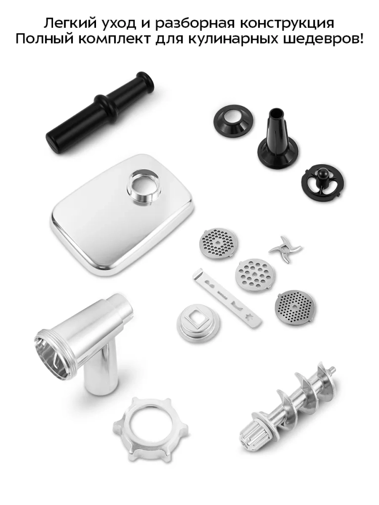 Электромясорубка Kitfort предлагает разнообразие функций благодаря комплекту насадок. В комплект входят насадки для приготовления колбасы, что позволяет создавать домашние колбасы с легкостью. Электрическая мясорубка также оснащена металлической решеткой, обеспечивающей равномерную рубку мяса.