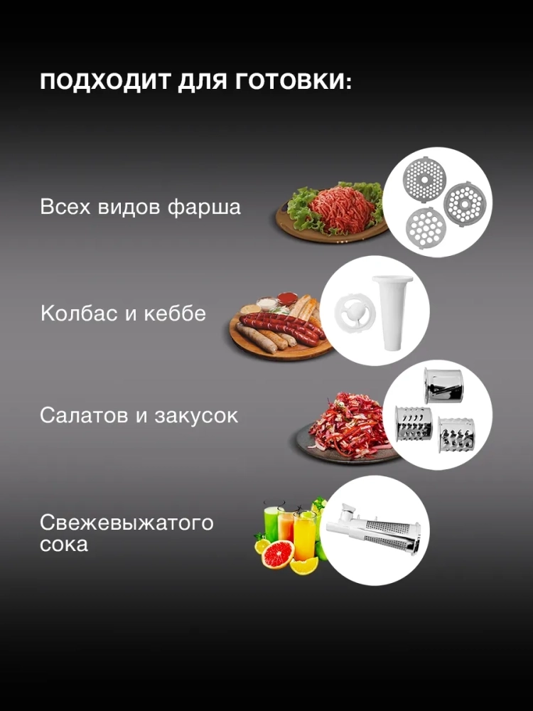 • Многофункциональность — в комплекте насадки для колбас, кеббе, овощерезки и соковыжималки.
