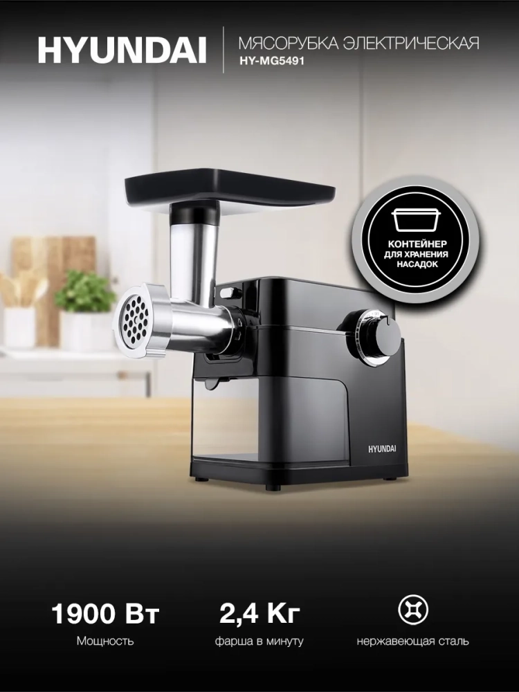 Мясорубка Hyundai HY-MG5491 черный/черный, мощность 1900Вт, дисков для фарша 3, материал лотка пластик, длина кабеля питания 1м, диски с отверстиями диаметром 3 мм, 5 мм и 7 мм