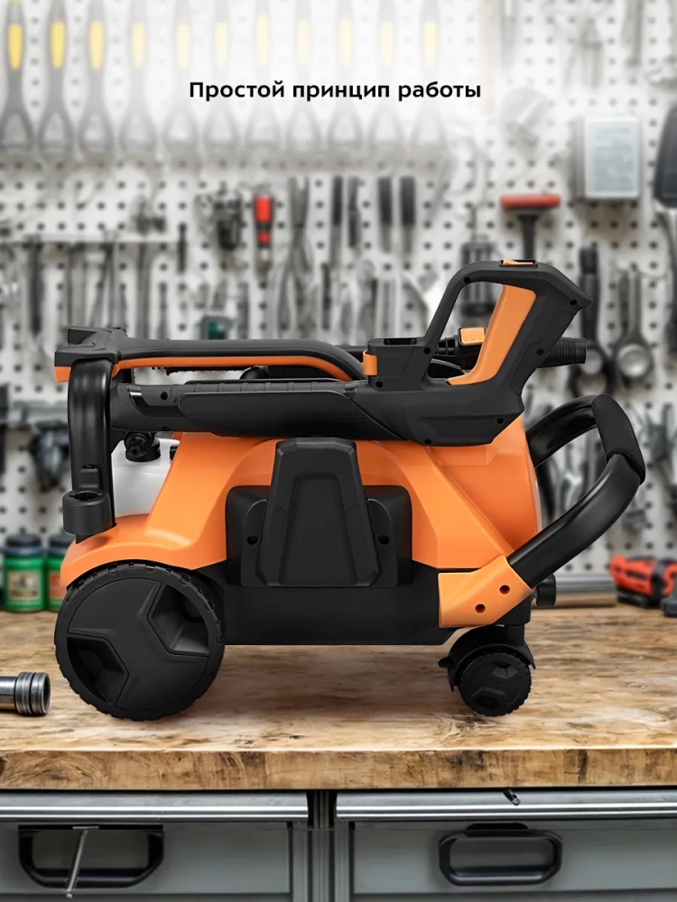 Для удобства хранения на корпусе есть держатели насадок, моющего пистолета, высоконапорного шланга и шнура питания. На корпусе есть ручка для переноски прибора, а также ручка и колеса для удобного перемещения во время работы устройства.
