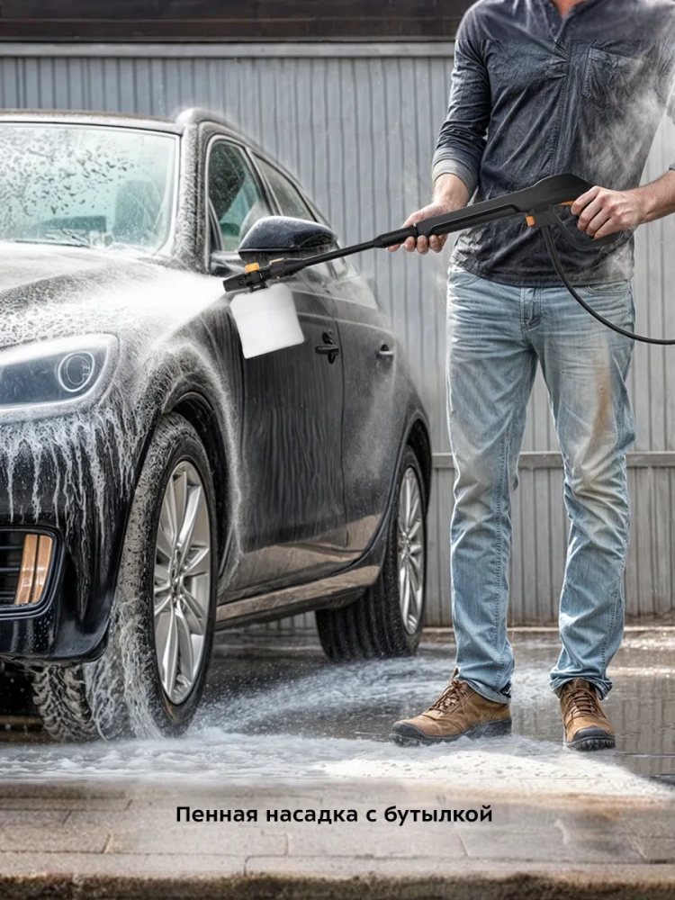 К соединительной насадке вы также можете присоединить пенную насадку с бутылкой, что позволяет быстро нанести моющее средство на очищаемую поверхность. Кроме того, в комплекте идет роторная насадка, которая обеспечивает повышенный напор воды и удаляет наиболее стойкие загрязнения.