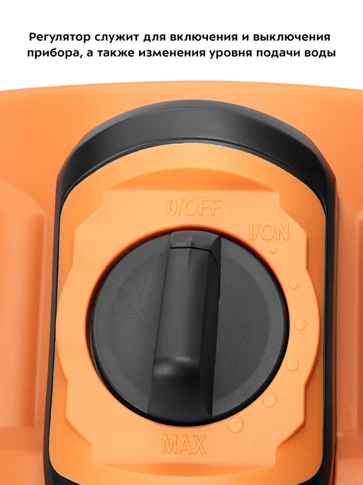 К прибору с помощью соединительной насадки крепится насадка с регулируемым соплом, которая позволяет выбрать точечную или веерную форму струи. Точечная струя используется для очистки стойких локальных загрязнений. Веерная струя оптимальна для обработки крупных поверхностей.