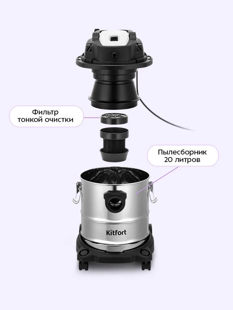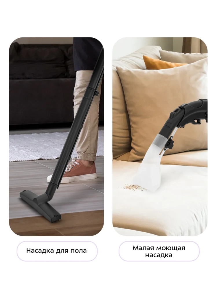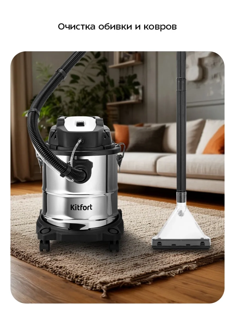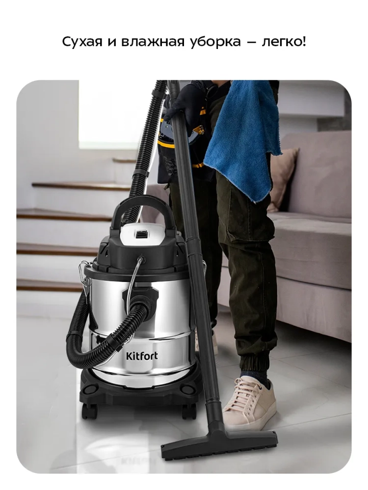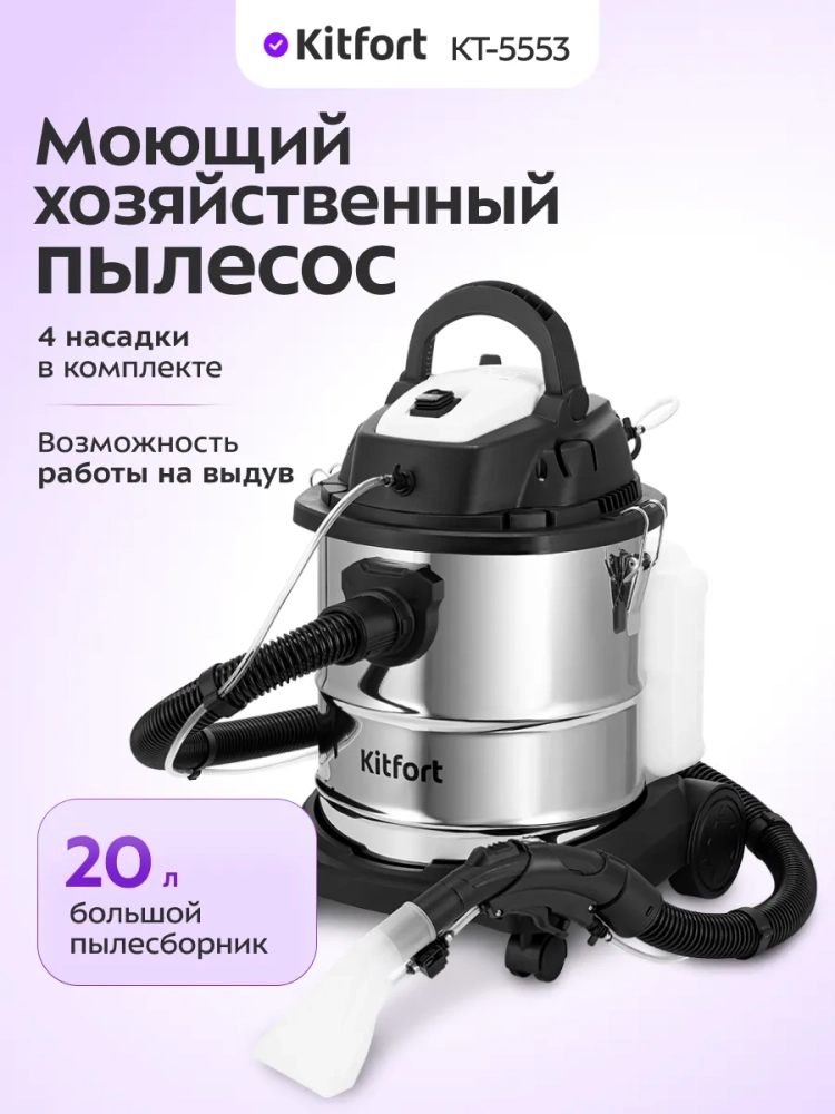 Моющий хозяйственный пылесос КТ-5553 от Kitfort — это универсальное устройство, которое станет незаменимым помощником в вашем доме. Этот мощный пылесос предназначен для сухой и влажной уборки различных поверхностей, включая мебель, ковры и полы. Благодаря функции выдува, он способен продувать вентиляционные решетки или сетки от комаров на окнах, а также очищать компьютер от пыли. Пылесос оснащен режимом влажной уборки для эффективного очищения обивки диванов и кресел. Он подает воду из резервуара на поверхность и всасывает её вместе с загрязнениями. В резервуар можно добавить специальное моющее средство для более качественной химчистки мягкой мебели и ковровых покрытий. Однако важно использовать только те средства, которые не образуют много пены. Устройство оборудовано фильтром тонкой очистки класса F9 и поролоновым фильтром для защиты мотора от попадания пыли. Пылесборник объемом 20 литров легко очищается благодаря сливному отверстию в нижней части — достаточно отсоединить пробку без необходимости переворачивать контейнер. С мощностью 1200 Вт этот проводной ручной помощник обеспечивает качественную уборку после ремонта или поддержание повседневной чистоты дома. Длина шнура составляет 6,9 м, что позволяет свободно перемещаться по комнате во время работы. Пылесос Kitfort КТ-5553 — это надежная техника для вашего дома! Он идеально подходит как для бытового использования, так и для профессиональной уборки помещений.