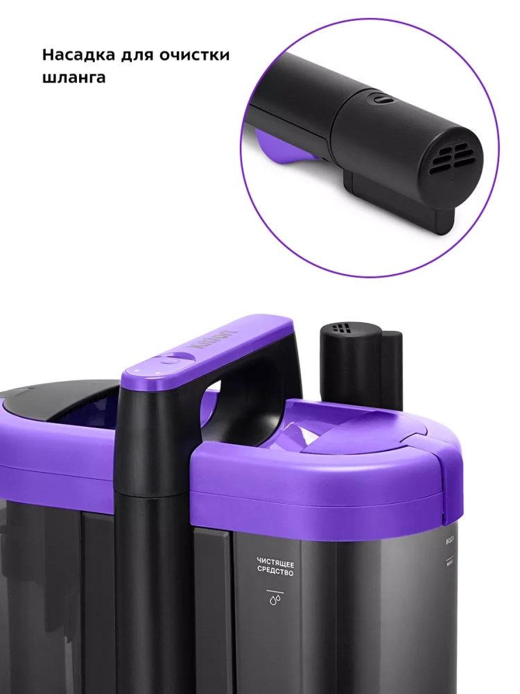 Чистить пылесос очень легко, так как насадки и резервуары снимаются и промываются проточной водой. Для очистки шланга предусмотрена специальная насадка для чистки.