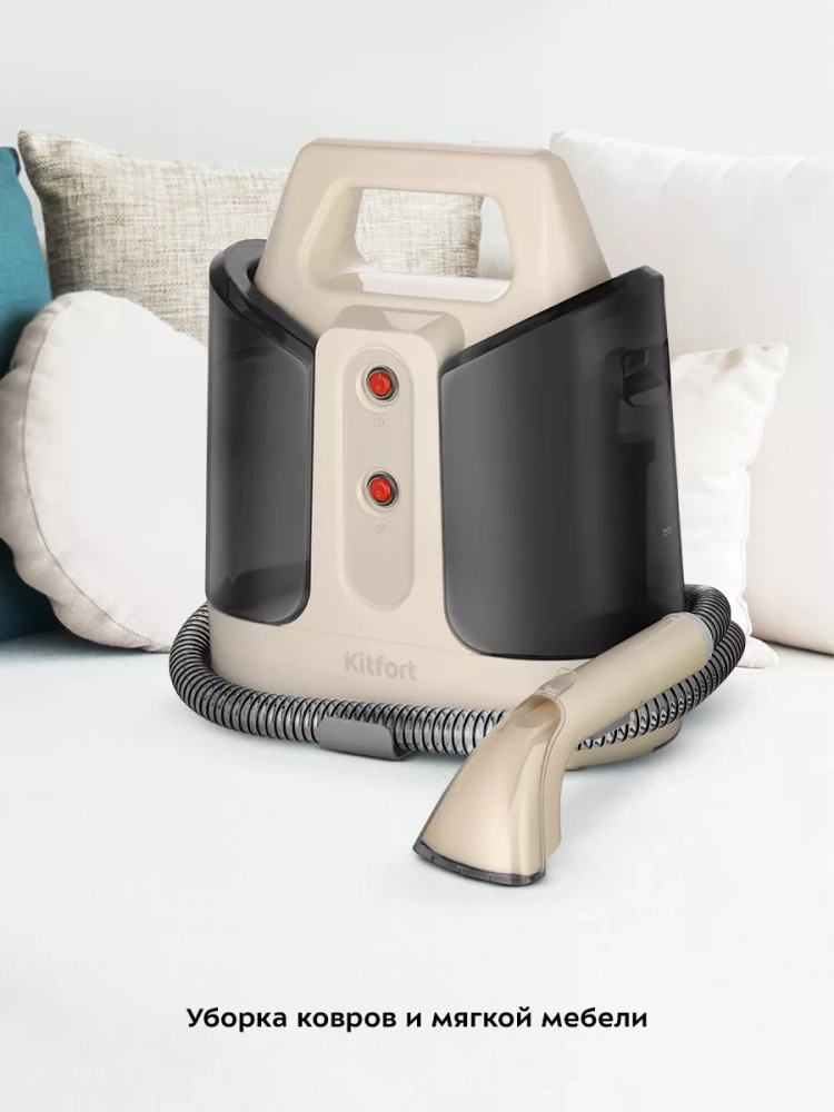 Моющий пылесос для ковров и мягкой мебели Kitfort KT-5240 поможет очистить обивку дивана, кресел, сидений в машине и другой мягкой мебели, а также ковры и ковровые покрытия. Пылесос автоматически подает чистую воду на очищаемую поверхность, а затем всасывает воду с пылью и другими загрязнениями. В резервуар для чистой воды можно добавлять воду или воду со специальным чистящим средством. В резервуаре для грязной воды предусмотрена защитная вставка с поплавком, который по мере наполнения резервуара поднимается. Когда резервуар для грязной воды наполнен выше максимально допустимого уровня, поплавок перекроет всасывающее отверстие и защитит двигатель от попадания влаги. В таком случае вы почувствуете, что пылесос перестал всасывать жидкость. Отключите пылесос и вылейте грязную воду из резервуара. Если резервуар для грязной воды переполнен, и вы не сразу выключили пылесос, она может вытекать снизу пылесоса. Это нормально, не является неисправностью и предотвращает попадание воды в двигатель.