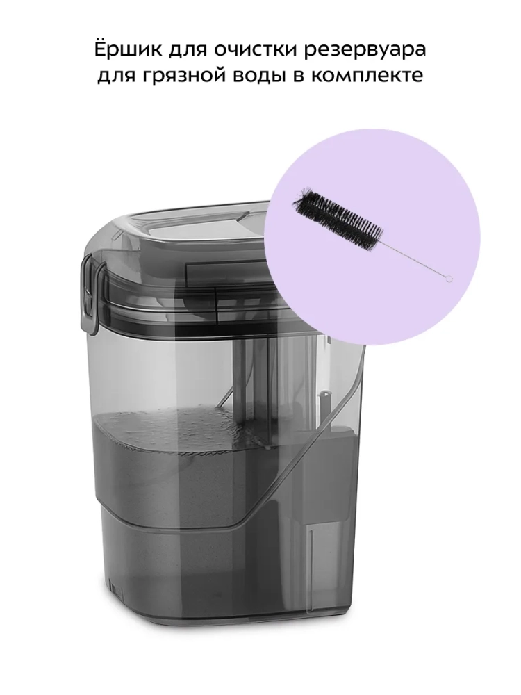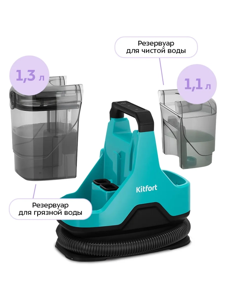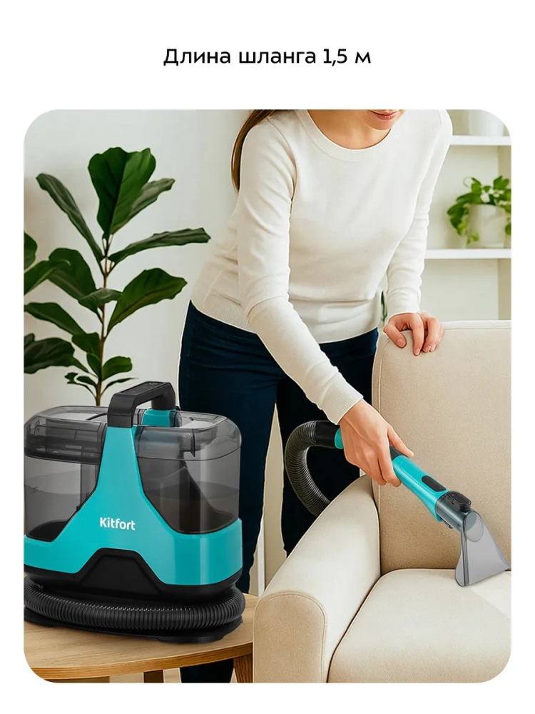 Моющий пылесос для ковров и мягкой мебели Kitfort KT-5521 поможет очистить обивку дивана, кресел, сидений в машине и другой мягкой мебели, а также ковры и ковровые покрытия. В резервуар для чистой воды можно добавлять воду с разведенным в ней специальным чистящим средством, не образующим большое количество пены. При нажатии на кнопку подачи воды пылесос подает воду на очищаемую поверхность, а затем всасывает воду с пылью и другими загрязнениями. Пыль и грязь оседают в воде в резервуаре для грязной воды. Когда резервуар для грязной воды будет наполнен выше максимально допустимого уровня, поплавок в резервуаре поднимется и перекроет всасывающее отверстие, бытовой пылесос прекратит всасывать жидкость. Это защитит двигатель от попадания влаги. Отключите пылесос и вылейте грязную воду из контейнера. Пылесос удобно перемещать за ручку. В комплекте идет ворсовая щетка и узкая насадка. Ворсовая щетка помогает собрать шерсть и волосы и подходит для очистки мягкой мебели и ковровых покрытий от въевшихся загрязнений. Узкую насадку удобно использовать для чистки щелей, углов и труднодоступных мест автомобиля. Узкая насадка, крышка всасывающего отверстия ворсовой щетки и резервуар для грязной воды выполнены из прозрачного пластика, поэтому в процессе уборки хорошо видно, как много грязи в авто собирает проводной моющий пылесос. Чистить моющий пылесос очень легко, так как насадки и резервуары можно снять и промыть проточной водой. У моющего пылесоса есть держатель рукоятки шланга, поэтому прибор можно компактно складывать и удобно хранить. Моющий пылесос предназначен только для влажной уборки пола. Он не подходит для того, чтобы просто пропылесосить диван или ковер шампунем. Напряжение: ~220–240 В, 50/60 Гц. Мощность: 600 Вт. Класс защиты от поражения электрическим током: II. Емкость резервуара для чистой воды: 1,3 л. Емкость резервуара для грязной воды: 1,1 л. Длина шланга: 1,5 м. Длина шнура: 2,9 м. Размер устройства: 307 х 215 x 318 мм.