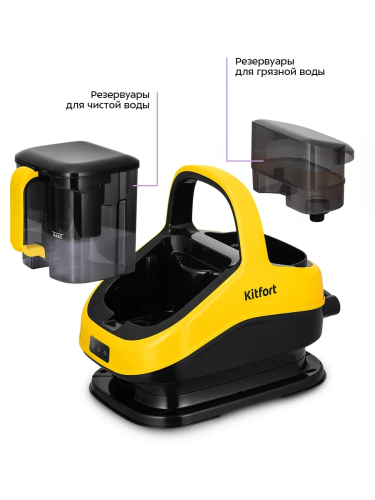 Паровой моющий пылесос для ковров и мягкой мебели Kitfort KT-5555 поможет очистить обивку дивана, кресел, сидений в машине и другой мягкой мебели, а также ковры и ковровые покрытия. Пылесос автоматически подает чистую воду или пар на очищаемую поверхность, а затем всасывает воду с пылью и другими загрязнениями. Пыль и грязь оседают в воде, в резервуаре для грязной воды. В резервуар для чистой воды добавляют воду. В резервуаре для грязной воды предусмотрен поплавок, который по мере наполнения резервуара поднимается. Когда резервуар для грязной воды будет наполнен выше максимально допустимого уровня, поплавок перекроет всасывающее отверстие и защитит двигатель от попадания влаги. В таком случае вы почувствуете, что пылесос перестал всасывать жидкость. Отключите пылесос и вылейте грязную воду из резервуара.