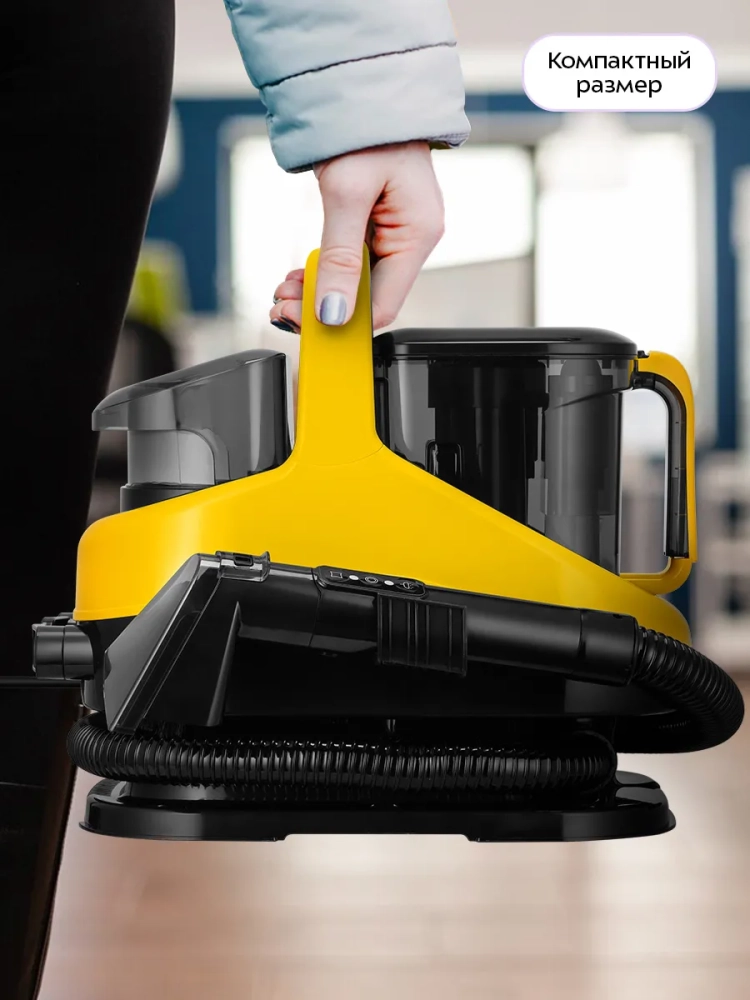 Благодаря небольшим размерам моющего пылесоса его легко можно перемещать за ручку ближе к зоне уборки. Длинные шнур и шланг обеспечивают удобство при уборке.