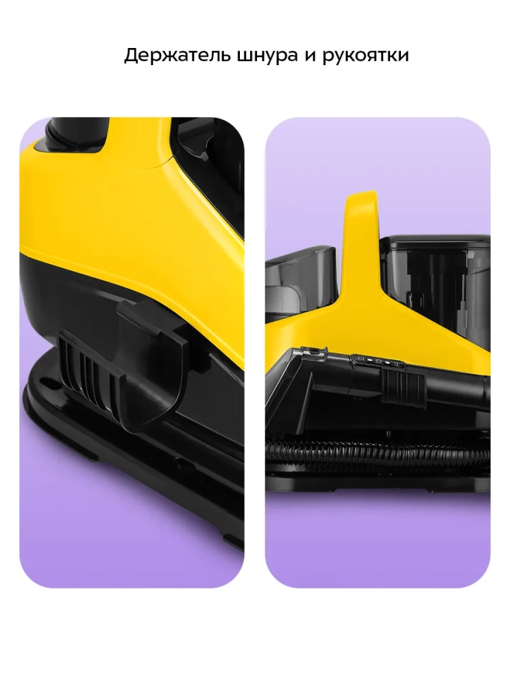 У моющего пылесоса есть держатели шнура и рукоятки, поэтому его можно компактно сложить и удобно хранить.