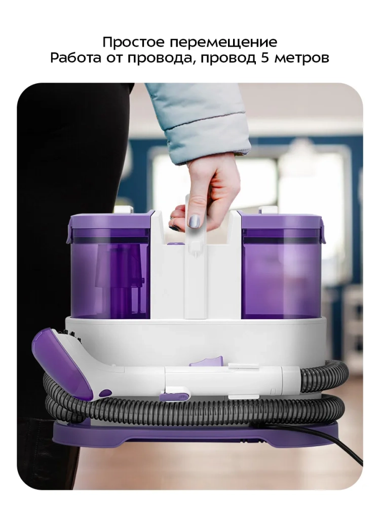 Чистить моющий пылесос очень легко, так как насадки и резервуары снимаются и промываются проточной водой. У моющего пылесоса есть крючок для шнура и держатель рукоятки, поэтому его можно компактно сложить и удобно хранить.