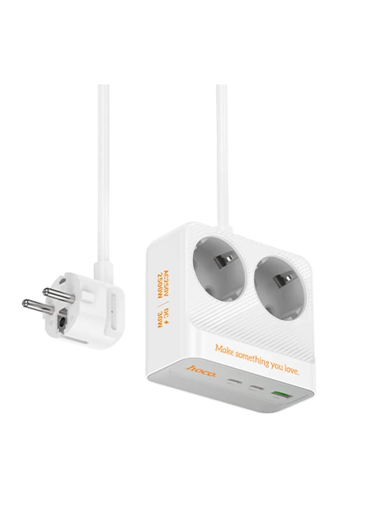 hoco AC27 - это сетевой фильтр объединяющий в себе функции удлинителя с двумя розетками и блока зарядки для смартфонов и других гаджетов (оснащен 1-м USB выходом и 2-мя Type-C)