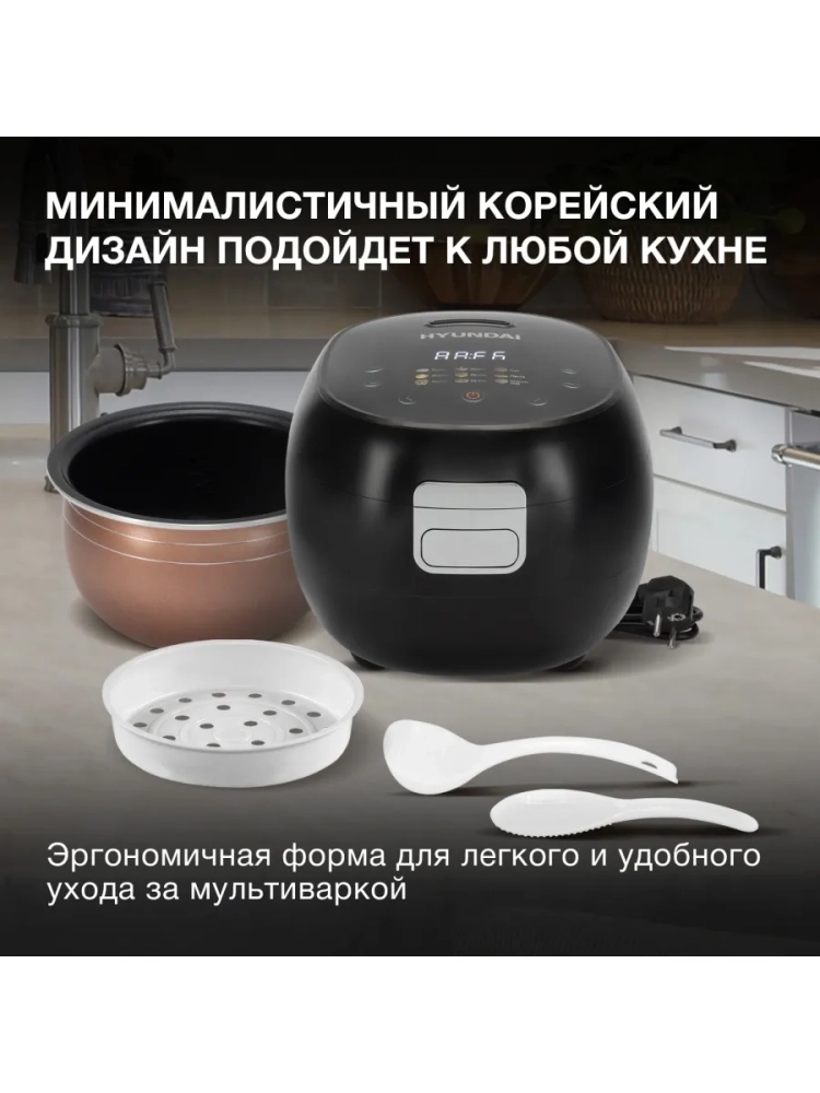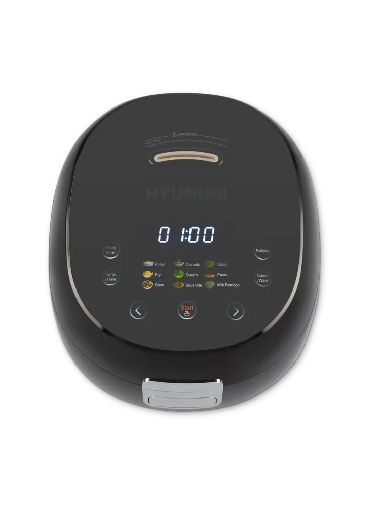 Мультиварка Hyundai HYMC-2409 черный, мощность 500Вт, объем чаши 3л, покрытие чаши Daikin.9 самых популярных авто программ приготовления, программа Мультишеф для полностью ручной настройки времени и температуры готовки, а так же функция подогрева и автоматического поддержания температуры после готовки.