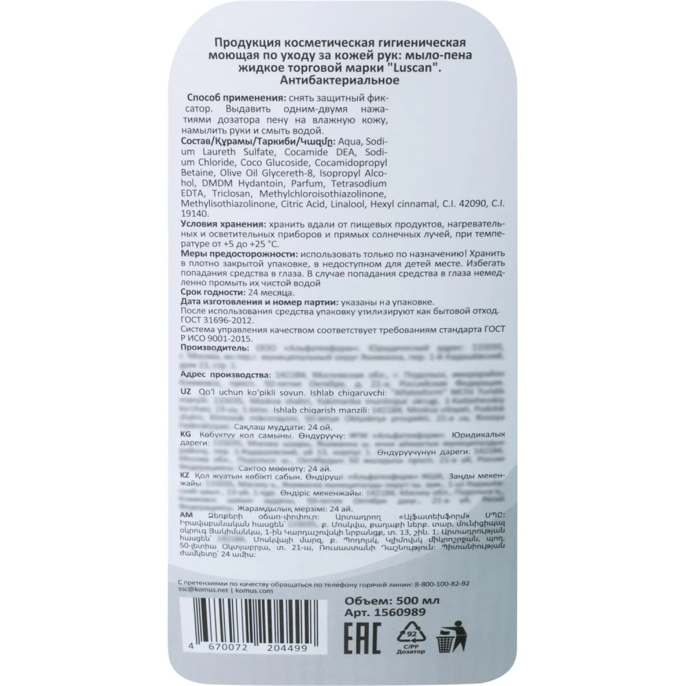 Мыло-пена жидкое Luscan антибактериальное 500мл с дозатором