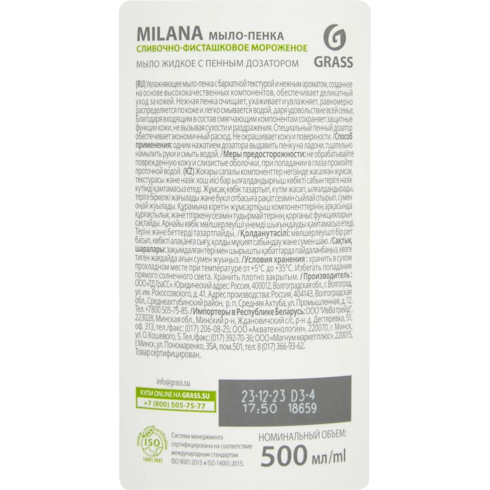Мыло жидкое Grass Milana сливочно-фисташковое мороженое 500мл