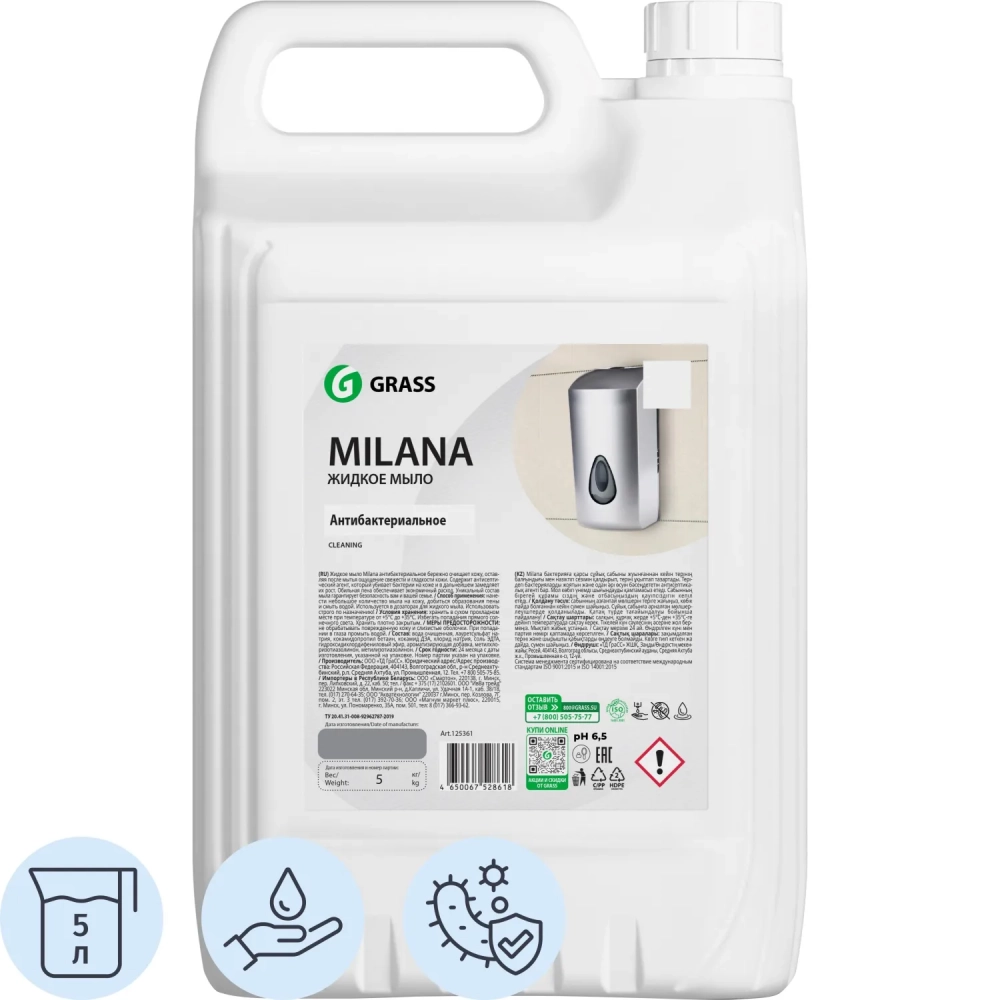 Мыло жидкое ПРОФ антибакт. б/запаха Grass/MILANA Антибактериальное, 5л