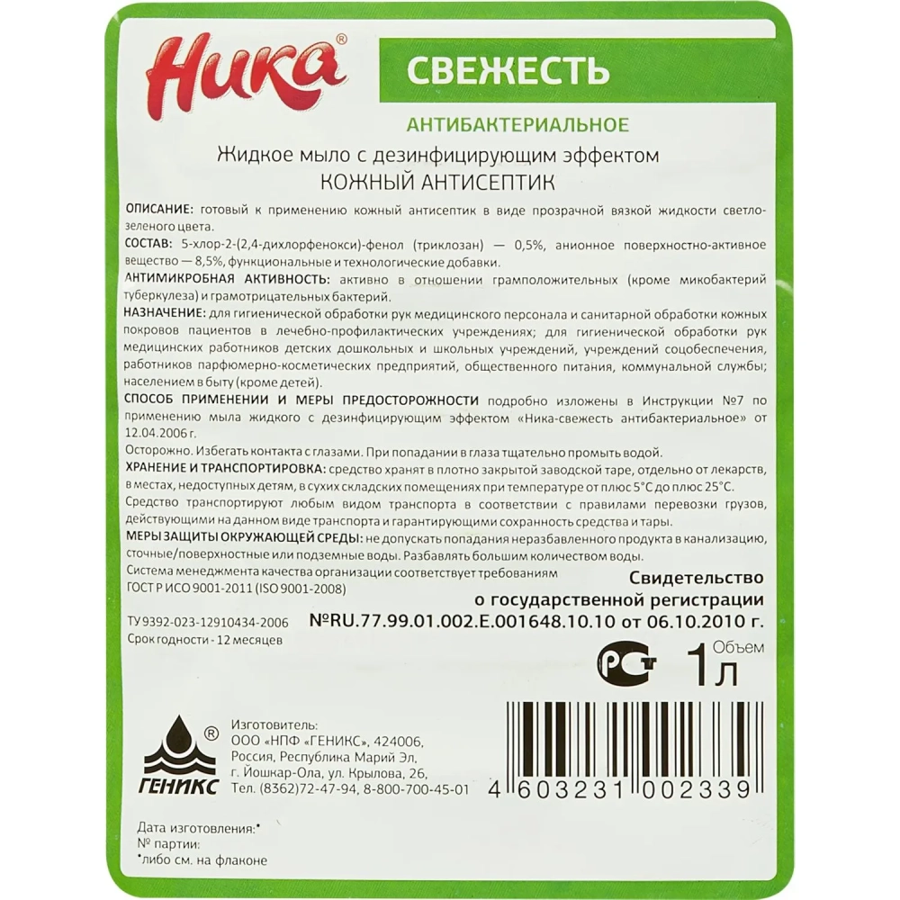 Мыло жидкое ПРОФ с дез-эфф Ника/Ника-Свежесть антибактериальное, 1л_ПЭТ