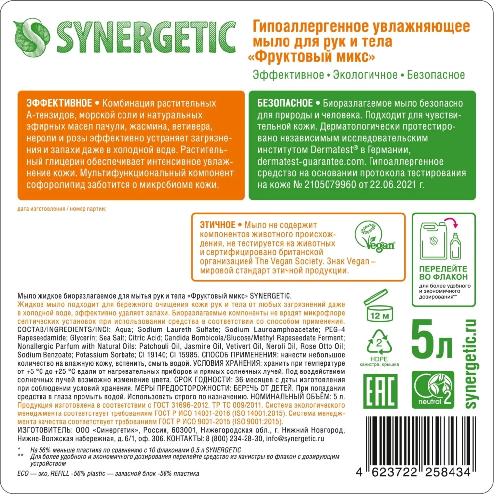 Мыло жидкое Synergetic Фруктовый микс 5л