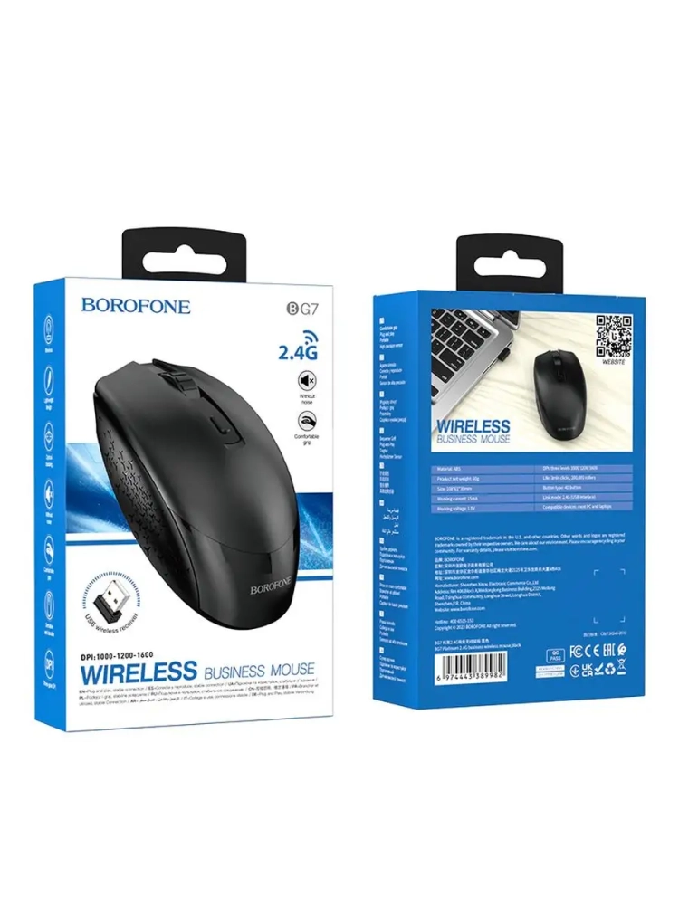 BOROFONE BG7 USB/1200dpi беспроводная, бесшумная, эргономичная оптическая мышь, выполненная в оригинальном дизайне. Обеспечивает плавное управление и точное передвижение курсора.