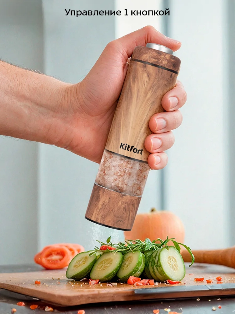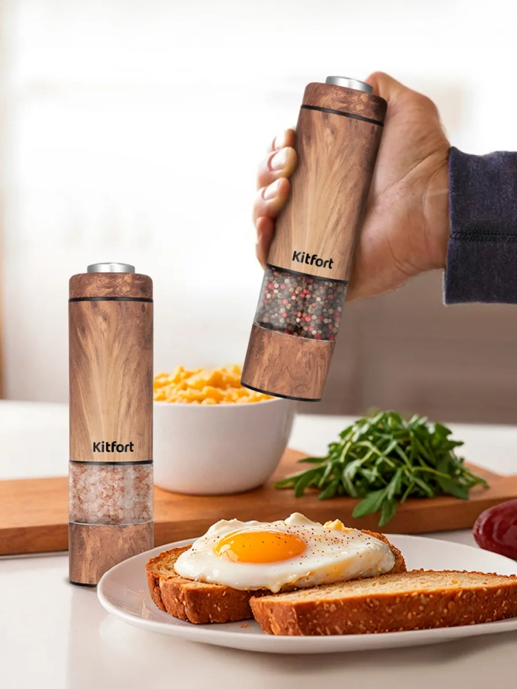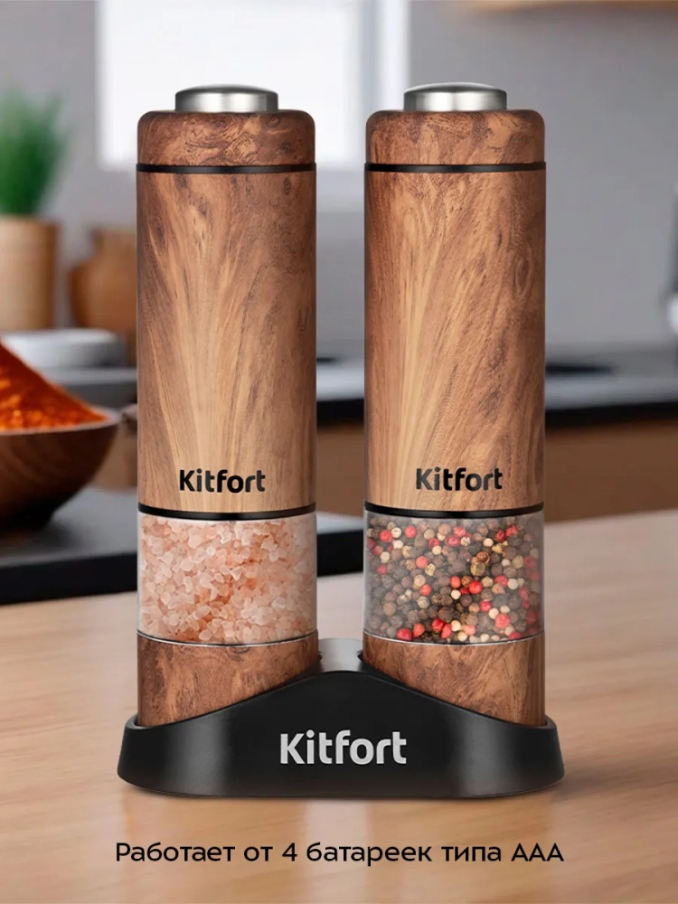 Электрическая мельница Kitfort КТ-6384 измельчает перец-горошек, соль и другие сухие специи. Степень помола регулируется винтом. Устройство имеет конические жернова из керамики, они долговечные, не стираются и не ржавеют. Мельница удобно лежит в руке, включается одной кнопкой и работает от 4 батареек типа ААА, которых хватает на долгое время. Батарейки в комплект не входят.