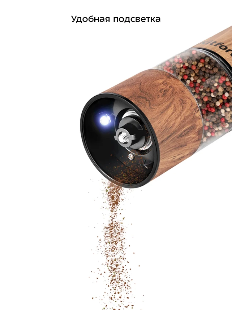 Во время помола снизу загорается подсветка, благодаря которой лучше видно количество смолотых специй.